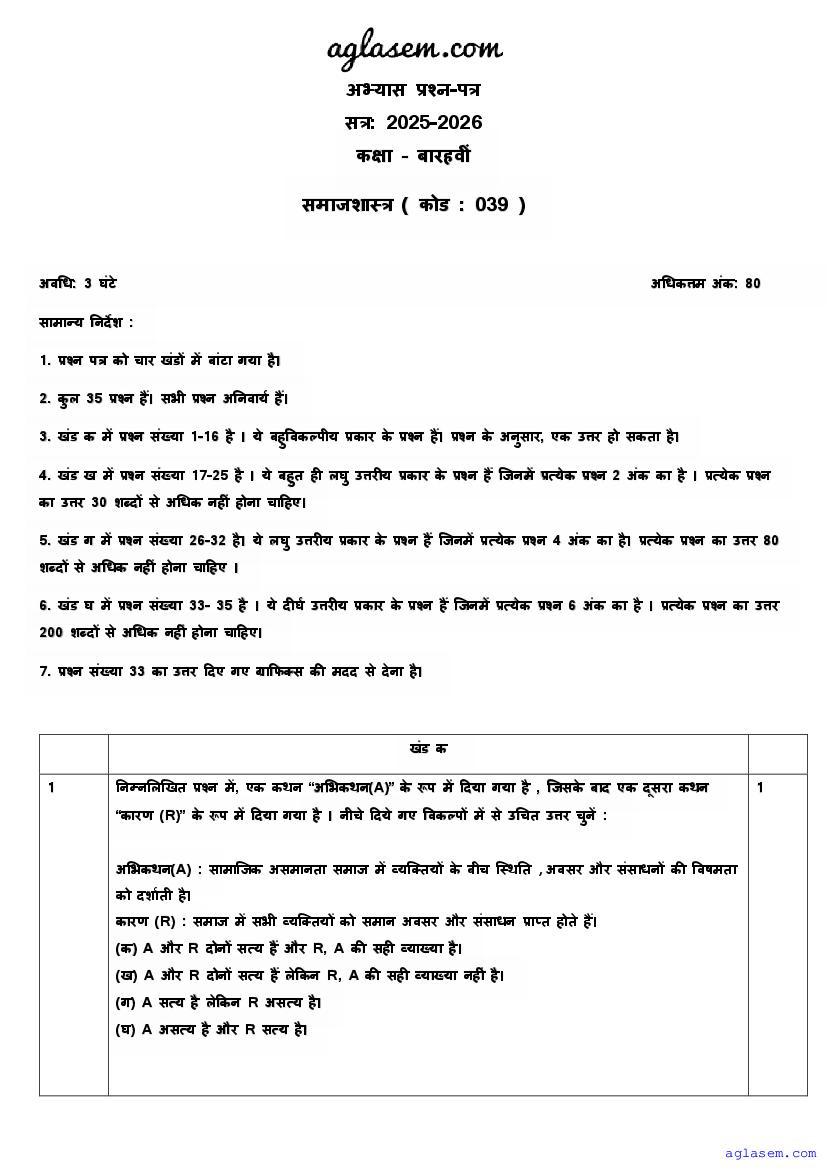Class 12 Sociology Sample Paper 2026 is now available! If you are currently in class 12 and preparing for your annual or final exams, don’t miss the opportunity to download the Sociology sample paper PDF from aglasem.com. This comprehensive sample paper is designed specifically for class 12 and includes a variety of questions covering the entire Sociology syllabus for class 12th. By practicing these questions, you’ll be well-equipped to achieve excellent marks in your class 12 yearly exams!