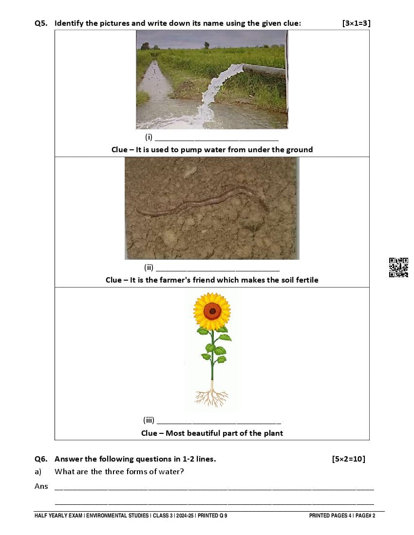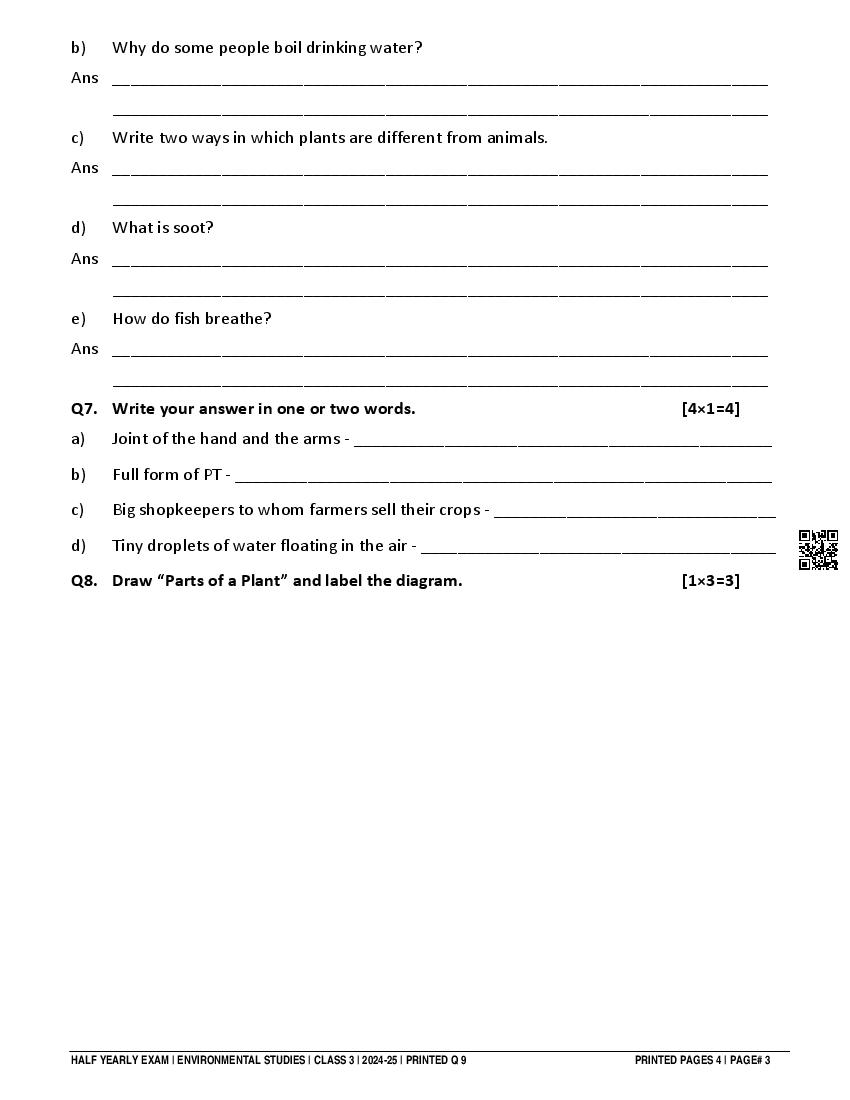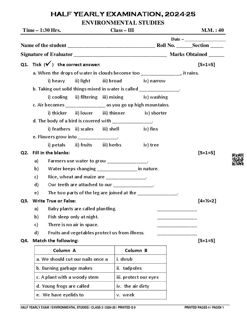 Class 3 EVS Half Yearly Question Paper 2025