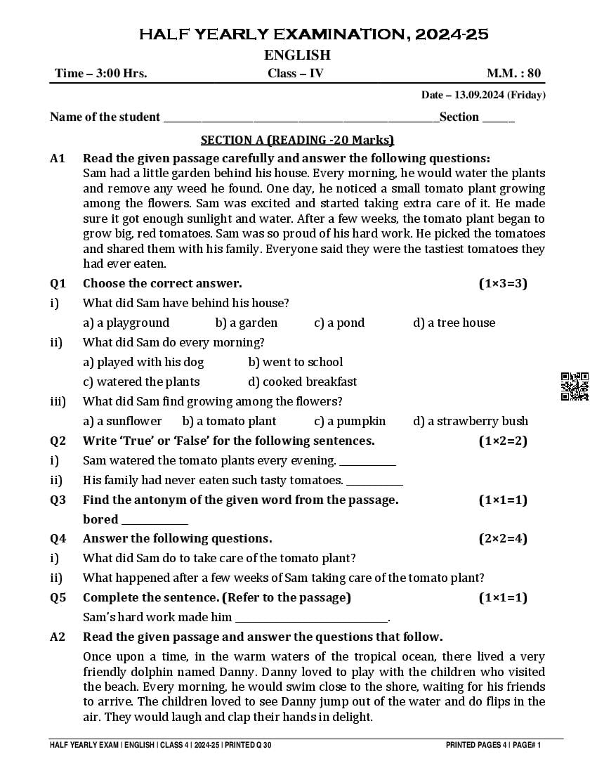 Class 4 English Half Yearly Question Paper 2025 PDF