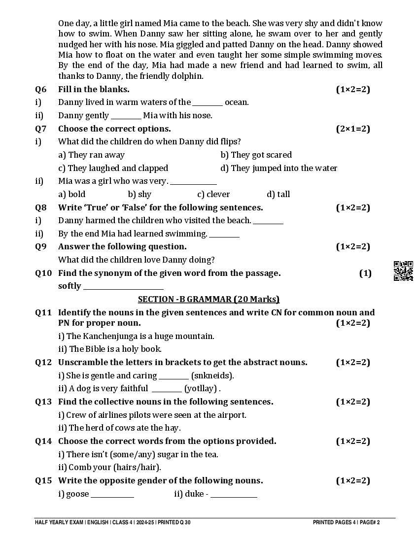 Class 4 Question Paper 2024-25 English (Half Yearly) View Download