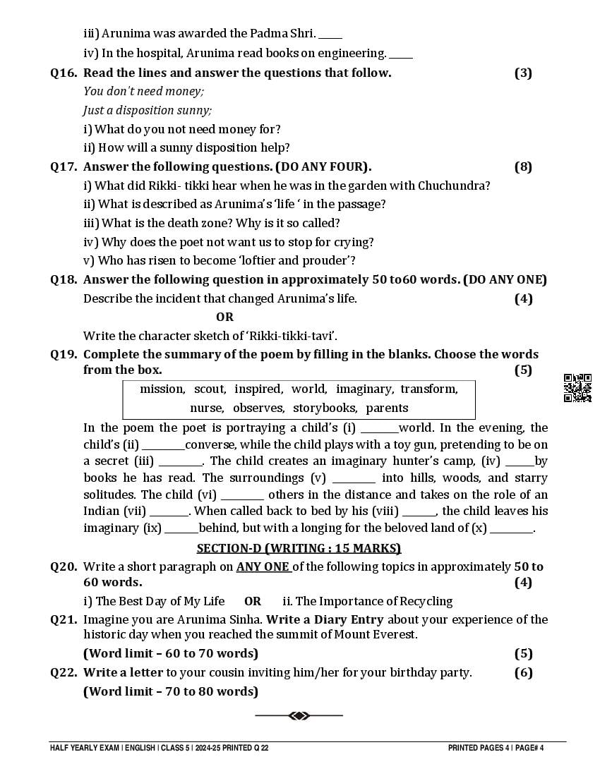 Class 5 Question Paper 2024-25 English (Half Yearly) View Download