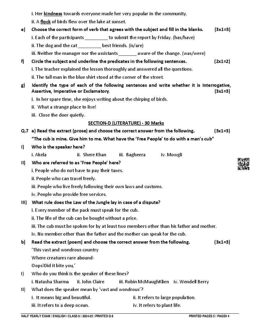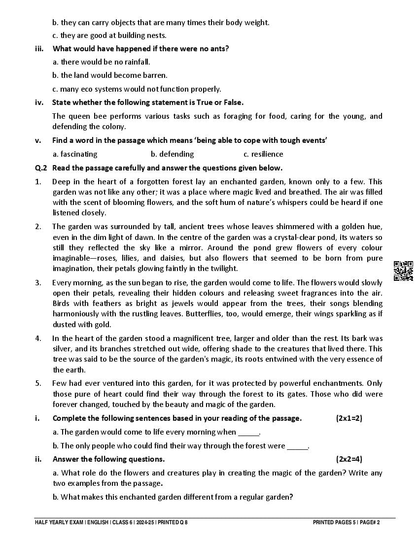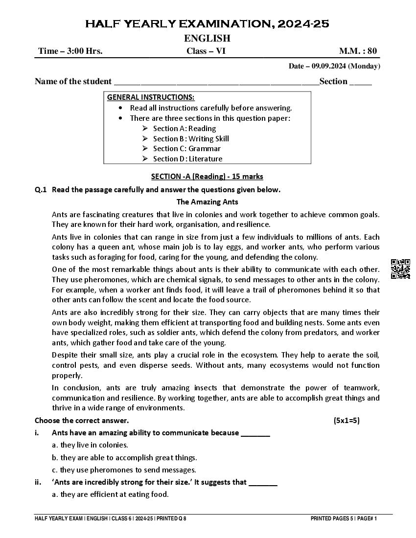 Class 6 Question Paper 2024-25 English (Half Yearly) View Download