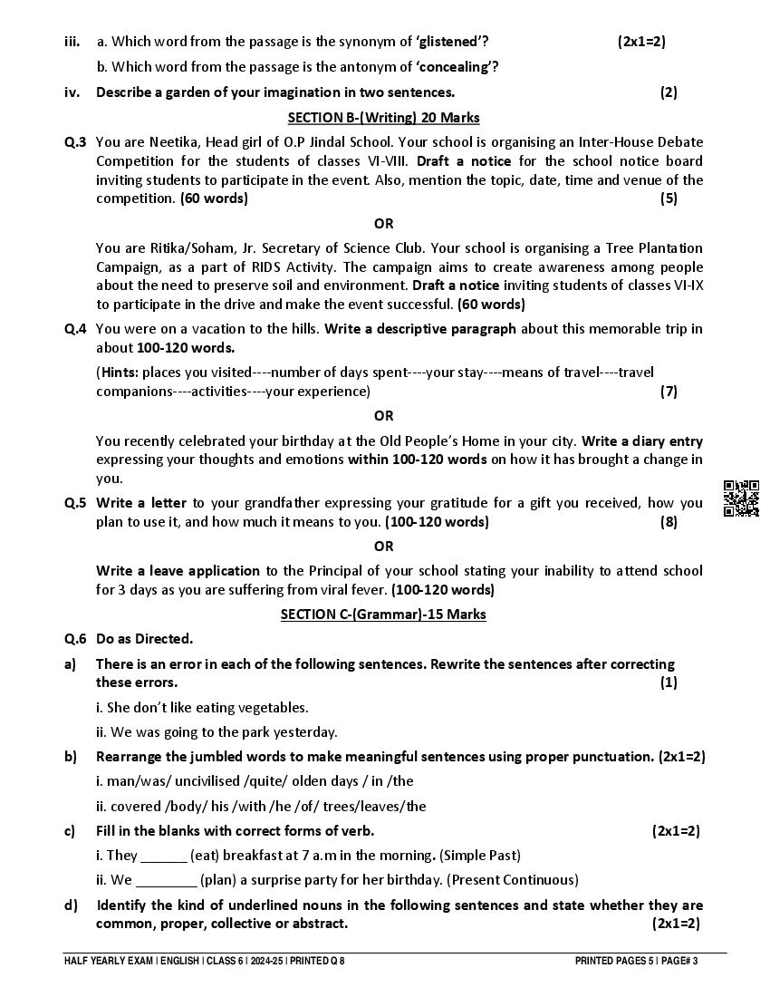 Class 6 English Half Yearly Question Paper 2025 PDF