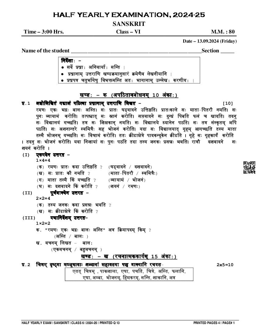 Class 6 Sanskrit Half Yearly Question Paper 2024-25 – Click Here to Download Question Paper PDF