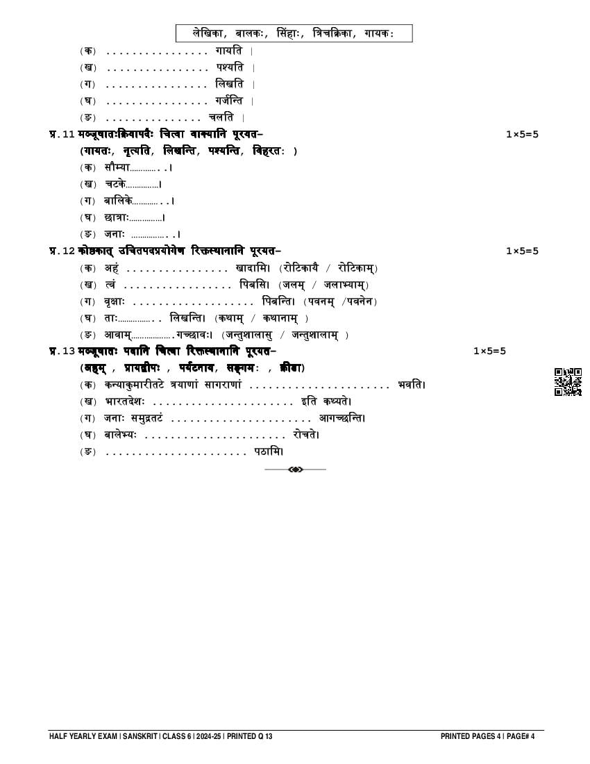 Class 6 Sanskrit Half Yearly Question Paper 2025