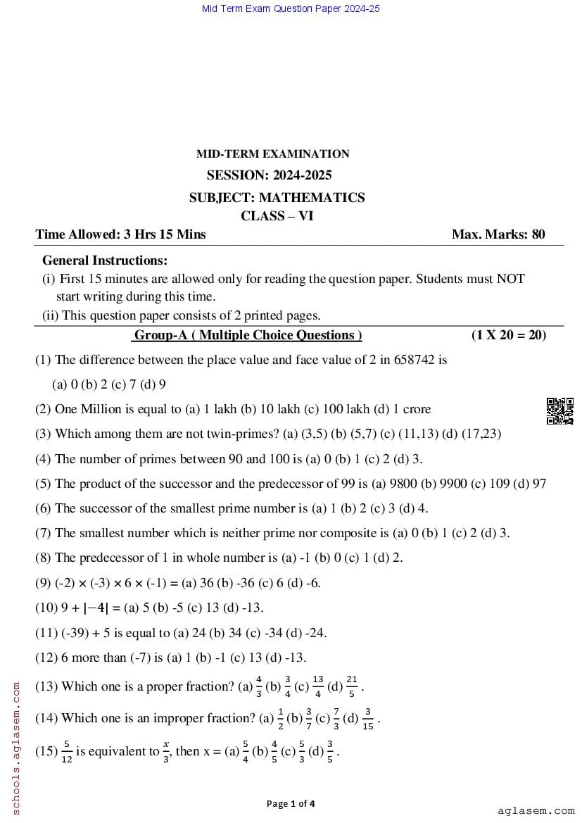 Download Class 6 Maths Mid Term Question Paper 2025 PDF