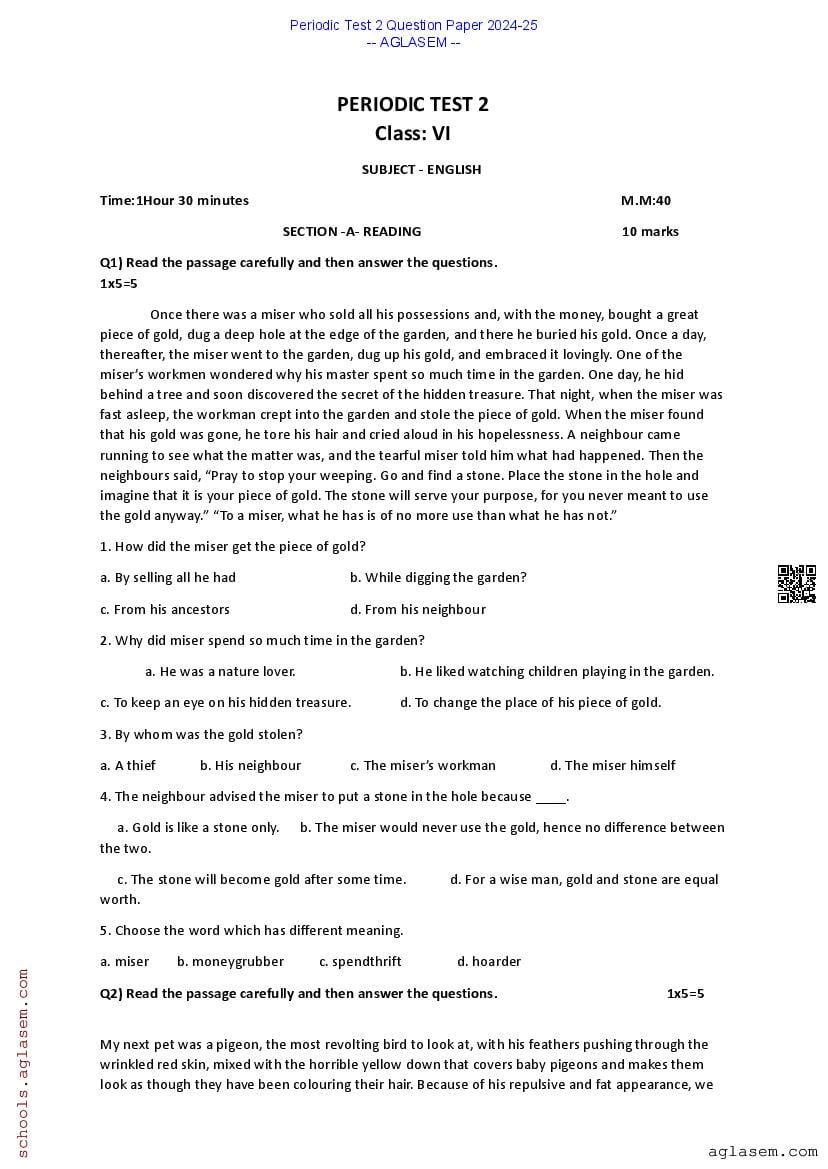 The Class 6 PT 2 Question Paper English 2024-25 PDF is is made available here by aglasem for your exam preparation. You can download the Class 6 PT II English Question Paper PDF from here on aglasem.com to prepare for this crucial exam. It is important to solve this English question paper, along with other Class 6 PT Question Paper if you are a student in the 6th grade, as it helps you understand the pattern and type of questions you will face in your upcoming periodic test exams. The English Periodic Test 2 Question Paper is designed to test the student’s understanding of various English concepts taught in the first term. Here, you will know everything about the Class 6 PT 2 English Question Paper, including tips, sample questions, and resources for effective preparation.