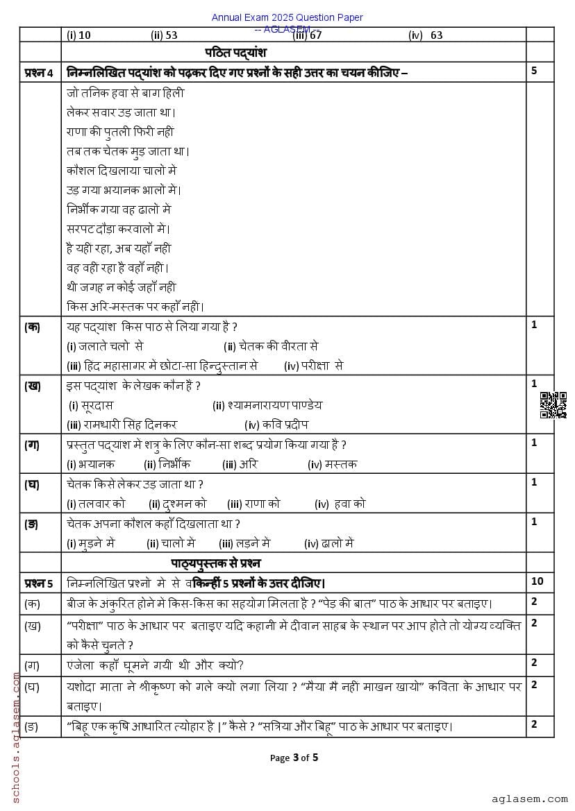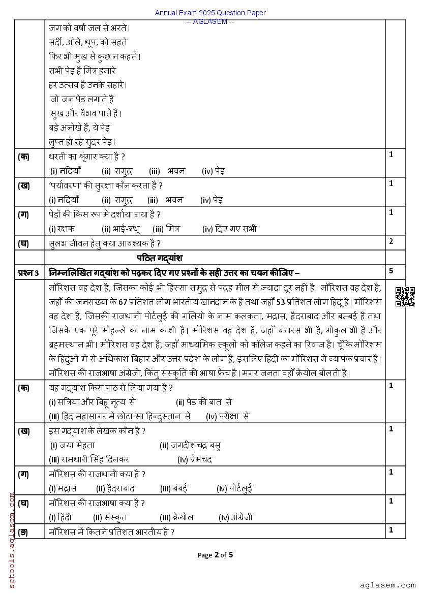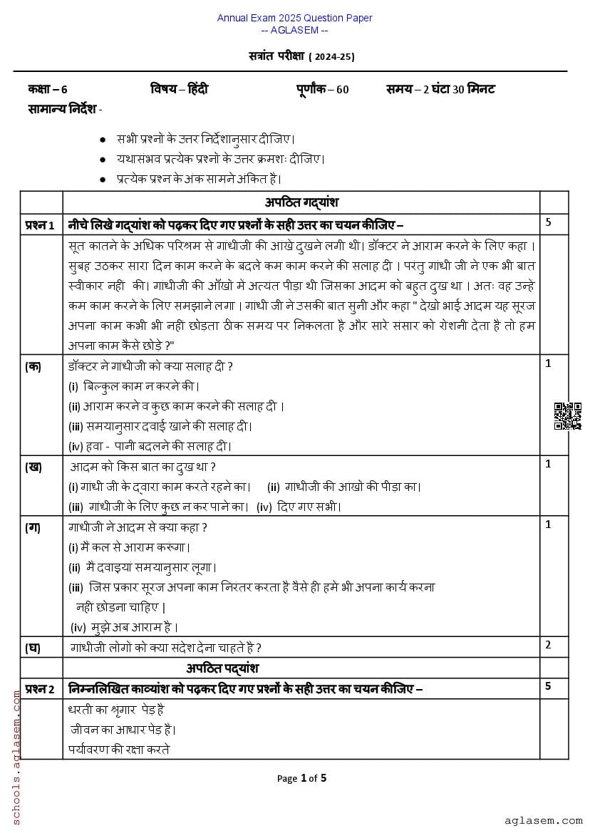 Class 6 Hindi Question Paper 2025 contains important practice questions and solutions based on the Hindi exam for 6th standard annual assessments. At aglasem.com, you can quickly download the 6th Annual Exam Hindi Question Paper PDF and previous year papers for free. The class 6 Hindi question paper is an essential study resource for exam preparation, helping you understand the exam pattern and frequently asked questions. If you are a 6th student, solving these Hindi previous year question papers will strengthen your preparation, improve time management, and boost confidence for the final exams.