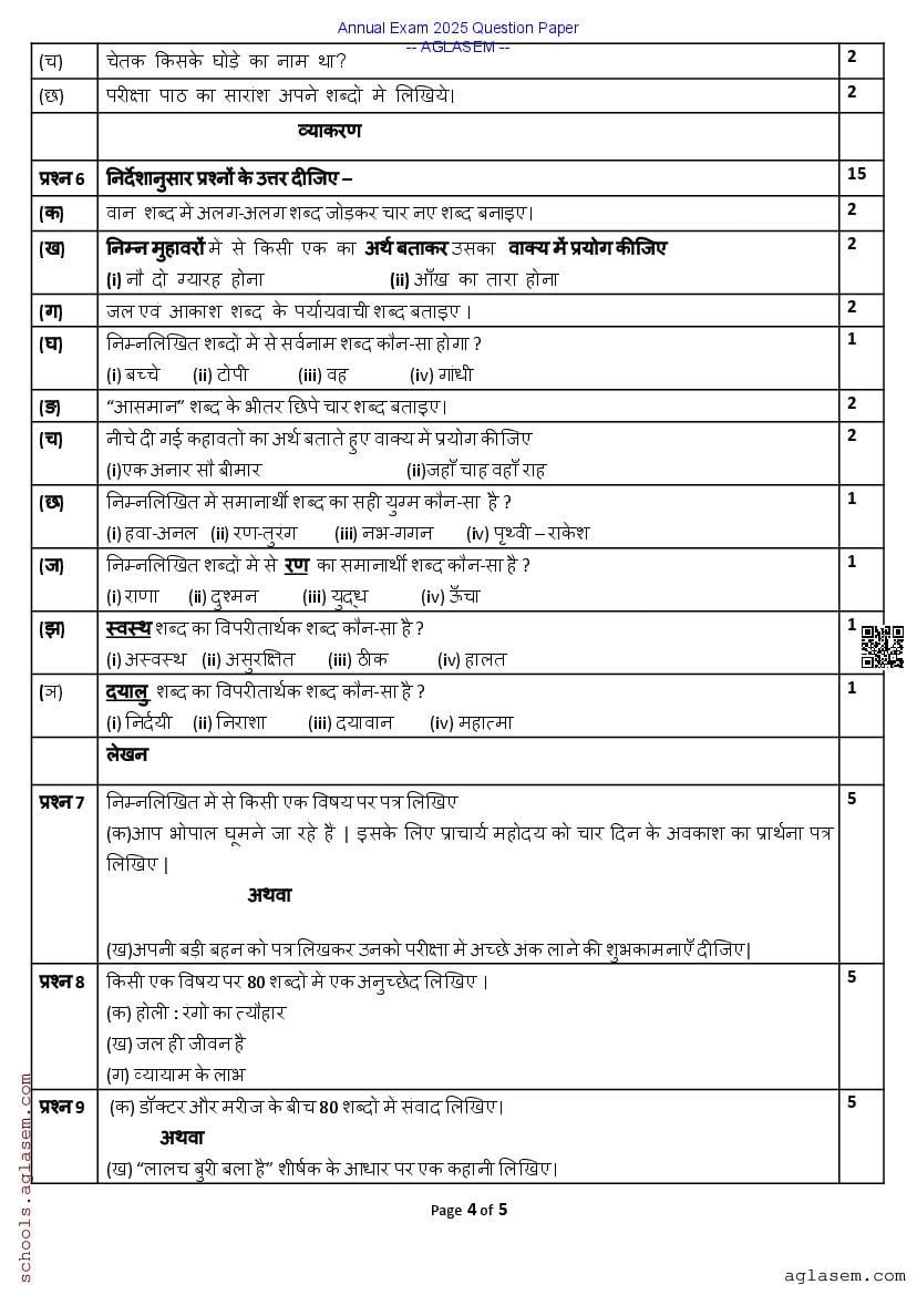 Class 6 Hindi Annual Exam Question Paper 2025 PDF