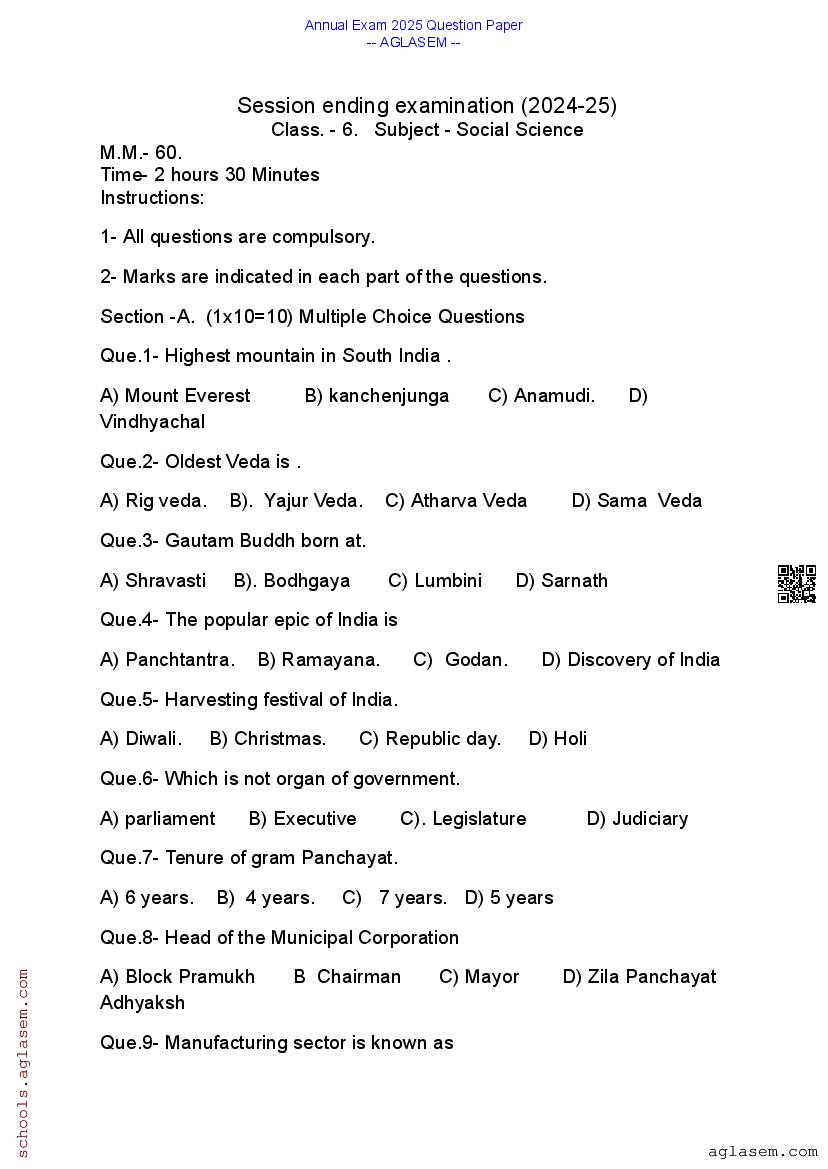 Class 6 Social Science Question Paper 2025 contains important practice questions and solutions based on the Social Science exam for 6th standard annual assessments. At aglasem.com, you can quickly download the 6th Annual Exam Social Science Question Paper PDF and previous year papers for free. The class 6 Social Science question paper is an essential study resource for exam preparation, helping you understand the exam pattern and frequently asked questions. If you are a 6th student, solving these Social Science previous year question papers will strengthen your preparation, improve time management, and boost confidence for the final exams.