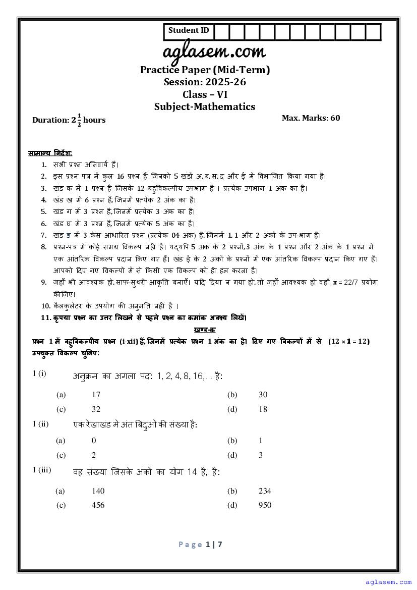 Class 6 Maths Sample Paper 2026 is now available! If you are currently in class 6 and preparing for your annual or final exams, don’t miss the opportunity to download the Maths sample paper PDF from aglasem.com. This comprehensive sample paper is designed specifically for class 6 and includes a variety of questions covering the entire Maths syllabus for class 6th. By practicing these questions, you’ll be well-equipped to achieve excellent marks in your class 6 yearly exams!