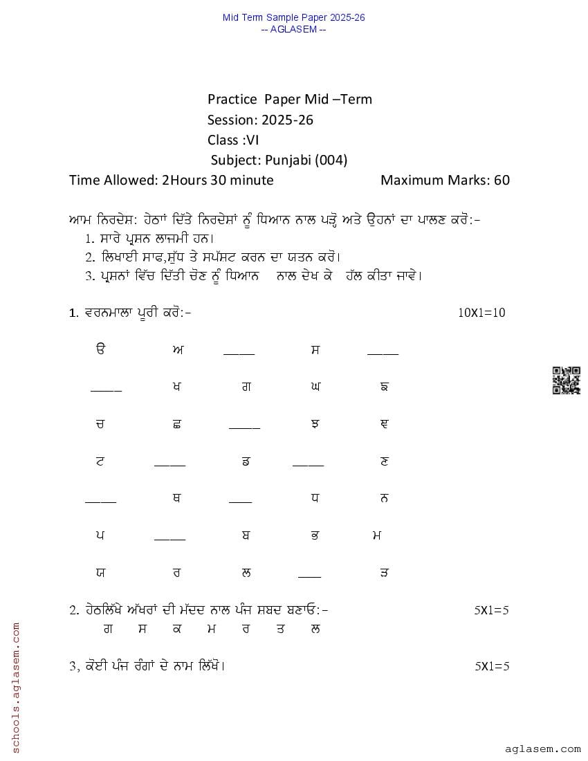 Get the Class 6 Punjabi Mid Term Sample Paper 2025 for your school mid term examination. These Class 6 Punjabi Mid Term Sample Paper 2025 for are developed by experts based on NCERT syllabus. You can now download the Class 6 Punjabi Mid Term Model Question Paper PDF here at aglasem. This class 6 mid term sample paper for Punjabi contains specimen questions from the latest class 6 Punjabi syllabus and gives you a good idea of what to expect in Punjabi paper in periodic tests, unit tests or term 1 examination. Therefore, by solving the Punjabi sample paper, you can aim for better marks in class 6 periodic test.