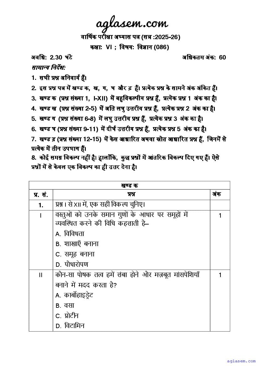 Class 6 Science Sample Paper 2026 is now available! If you are currently in class 6 and preparing for your annual or final exams, don’t miss the opportunity to download the Science sample paper PDF from aglasem.com. This comprehensive sample paper is designed specifically for class 6 and includes a variety of questions covering the entire Science syllabus for class 6th. By practicing these questions, you’ll be well-equipped to achieve excellent marks in your class 6 yearly exams!