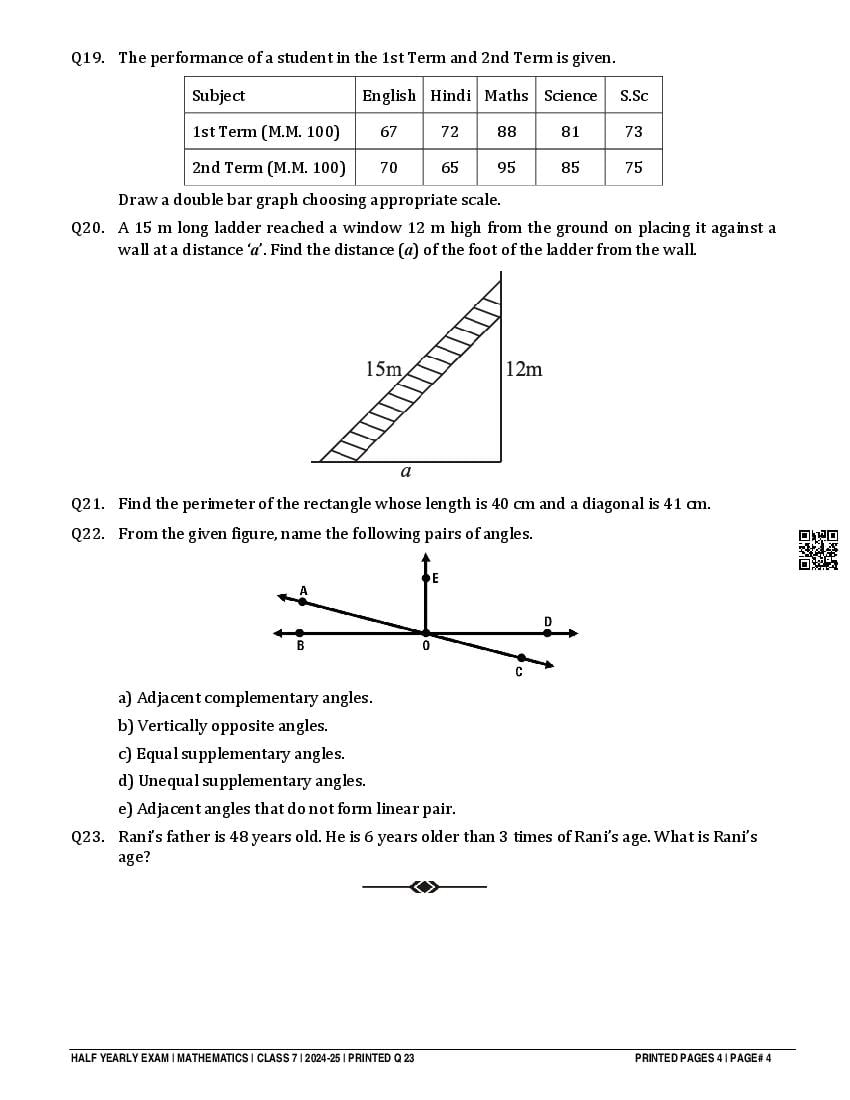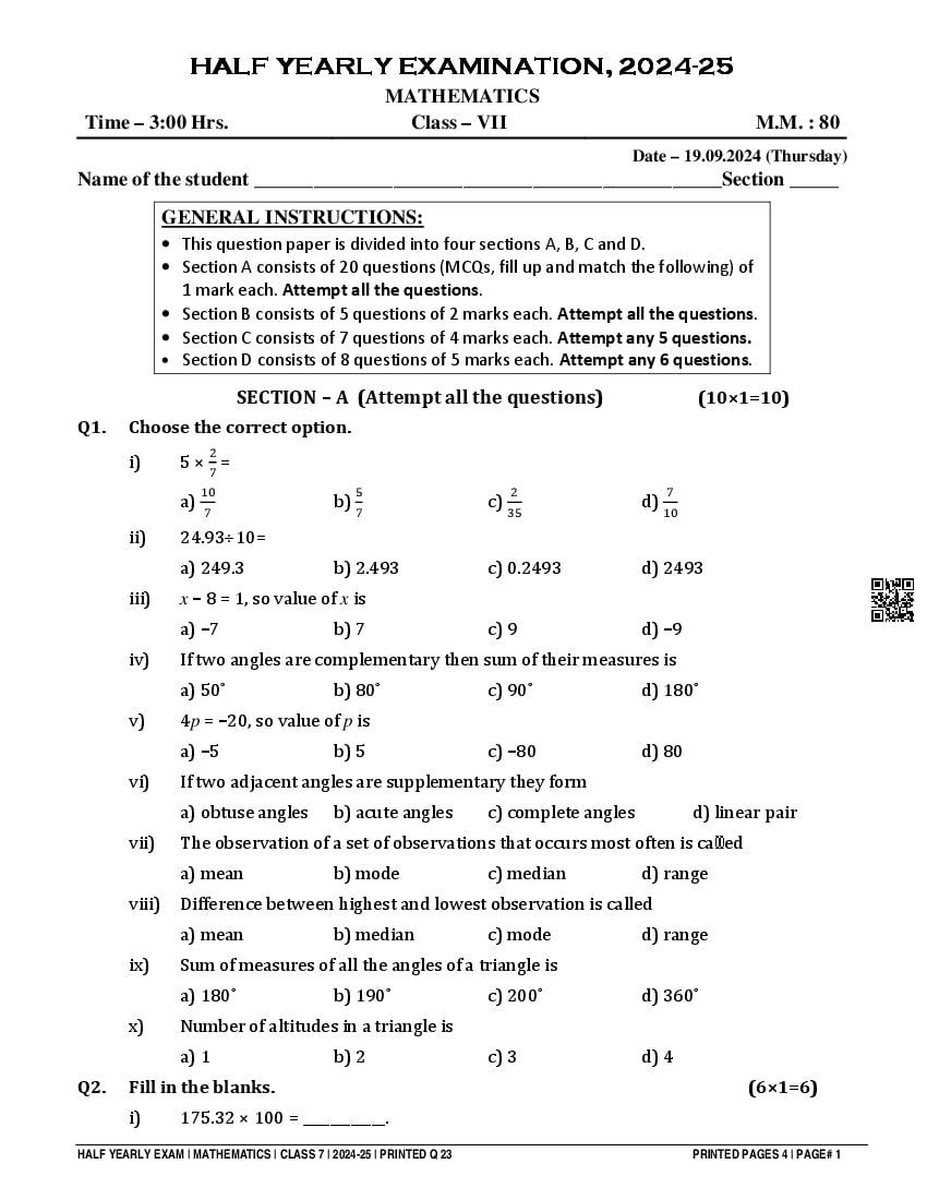Class 7 Question Paper 2024-25 Maths (Half Yearly) View Download