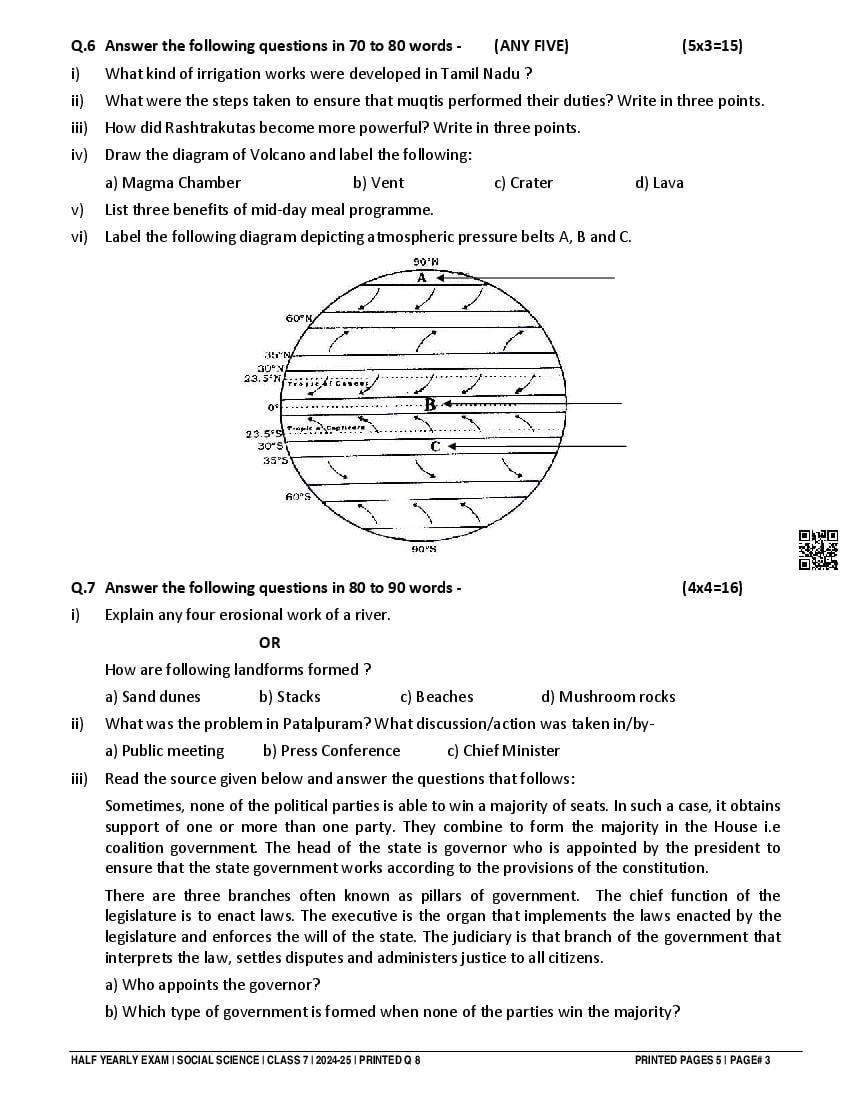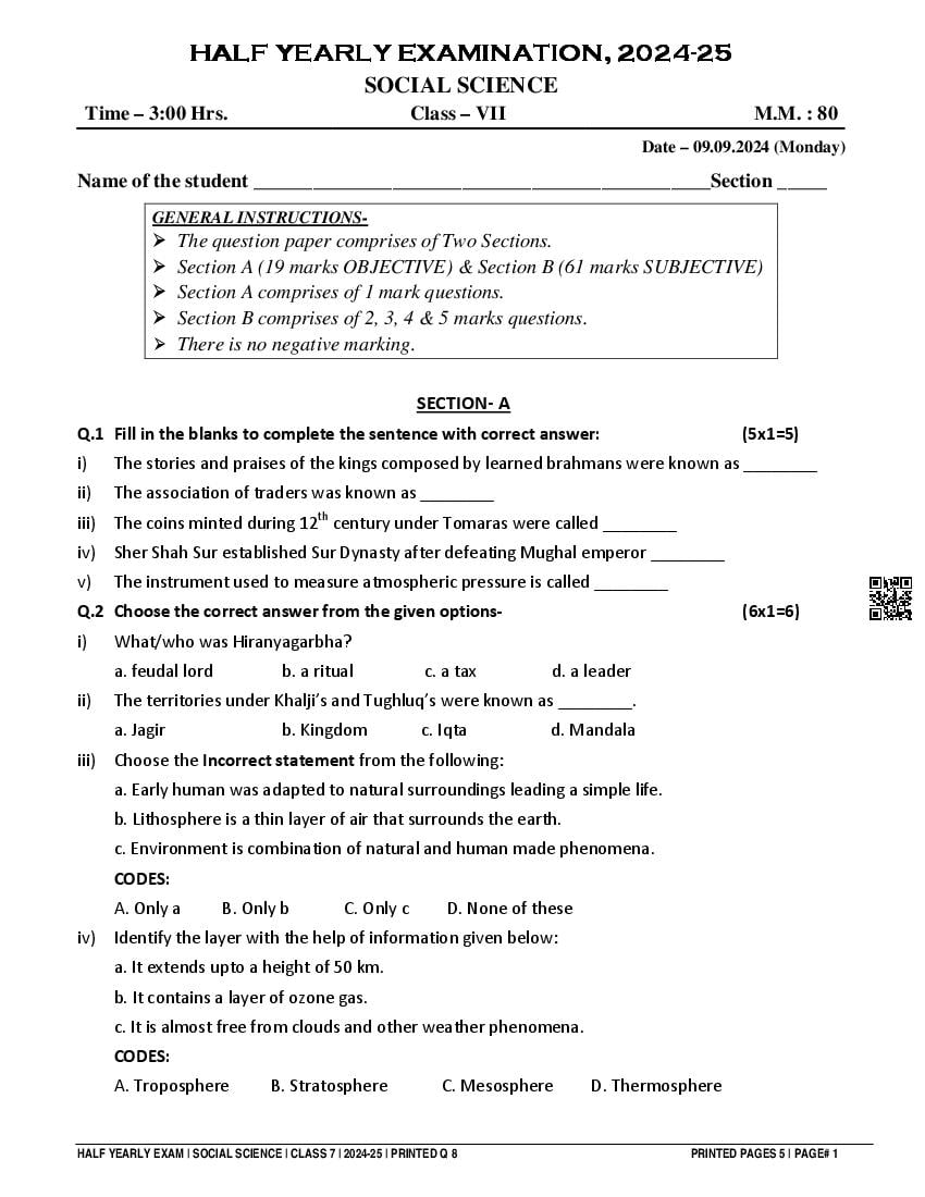 Class 7 Social Science Half Yearly Question Paper 2025