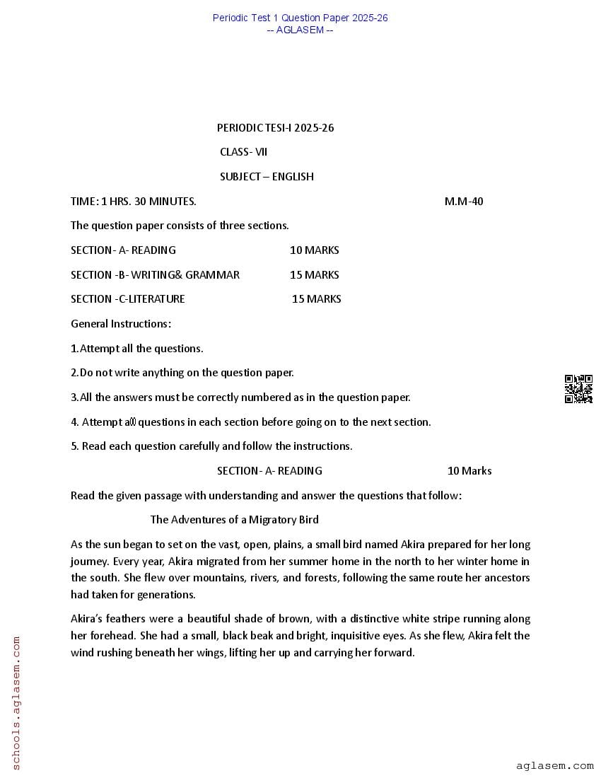 Class 7 PT 1 English Question Paper 2025-26 PDF