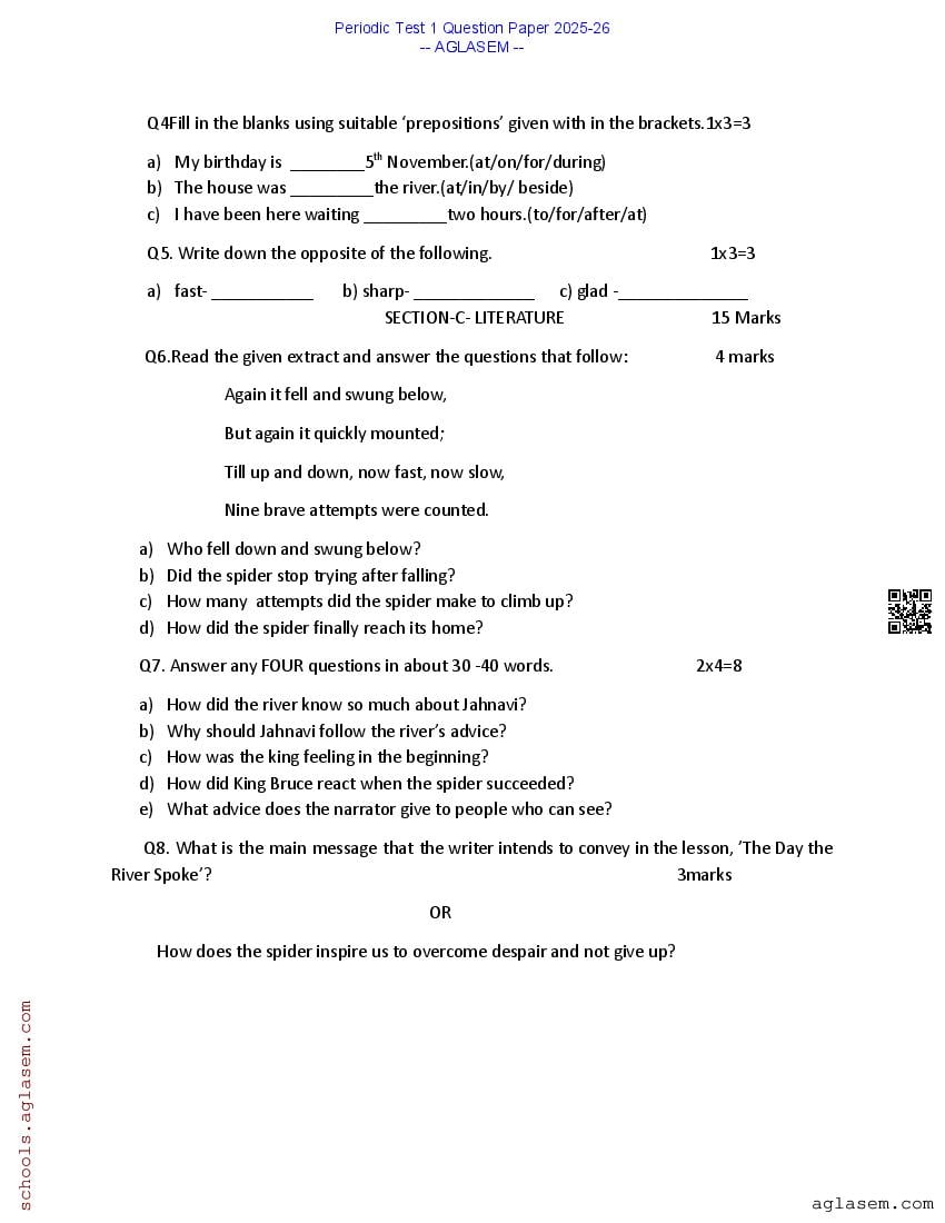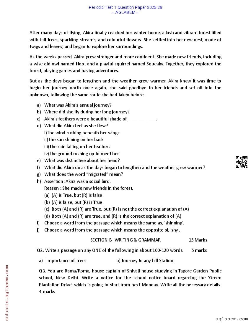 The complete pdf for Periodic Test I Question Paper for English is as follows.