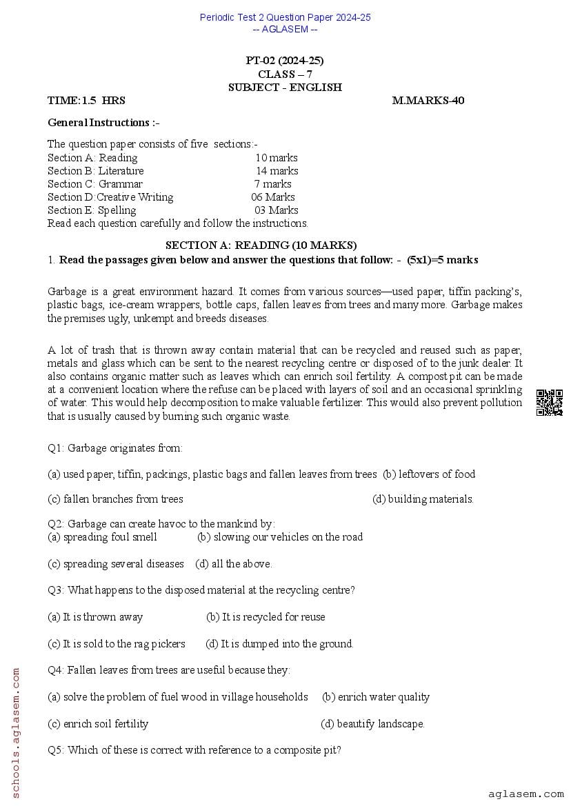 | Question paper Here | Class 7 Previous Year Question Paper for PT II for English |