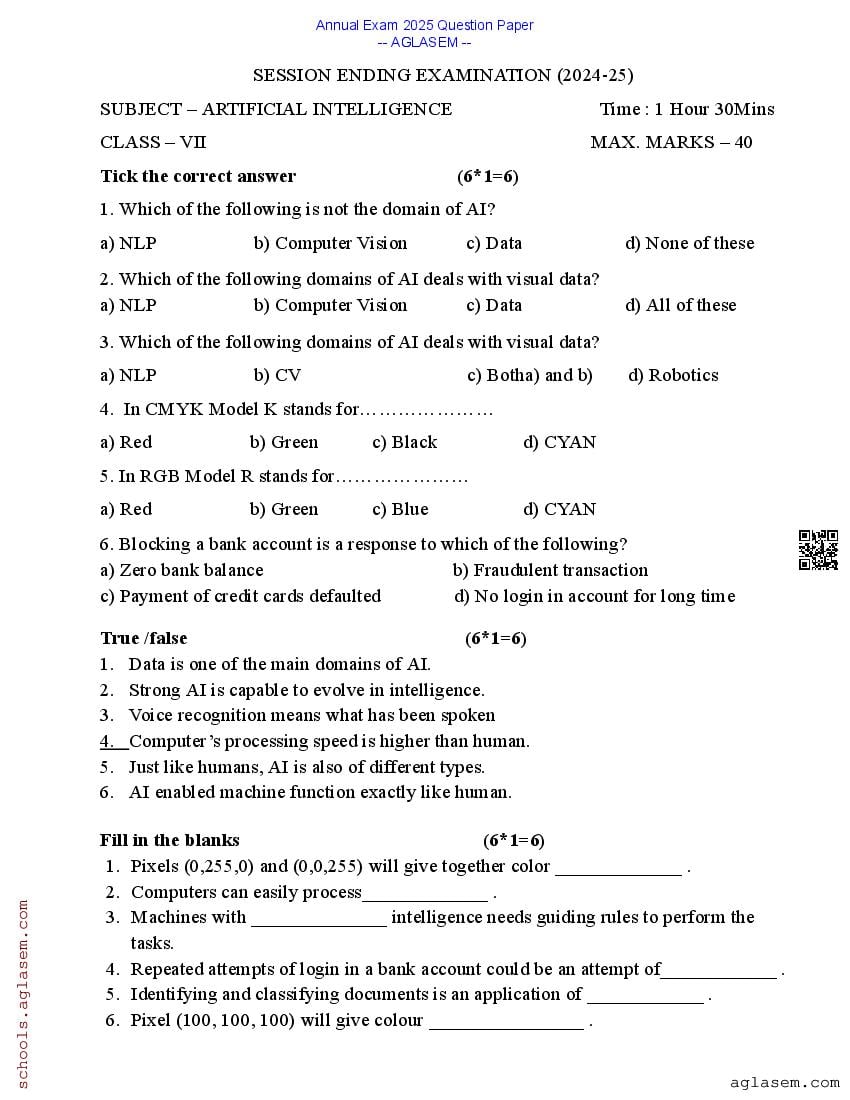 Class 7 Artificial Intelligence Question Paper 2025