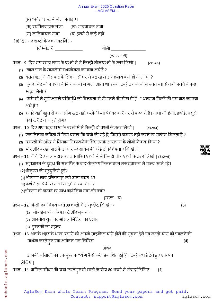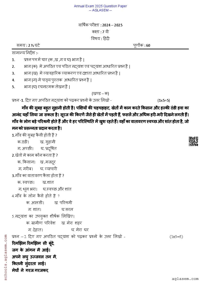 We have provided you the direct link to download Hindi question paper above. However if you want to read the 7th Hindi Annual Exam exam question paper here itself, that is also possible. The complete paper is as follows.