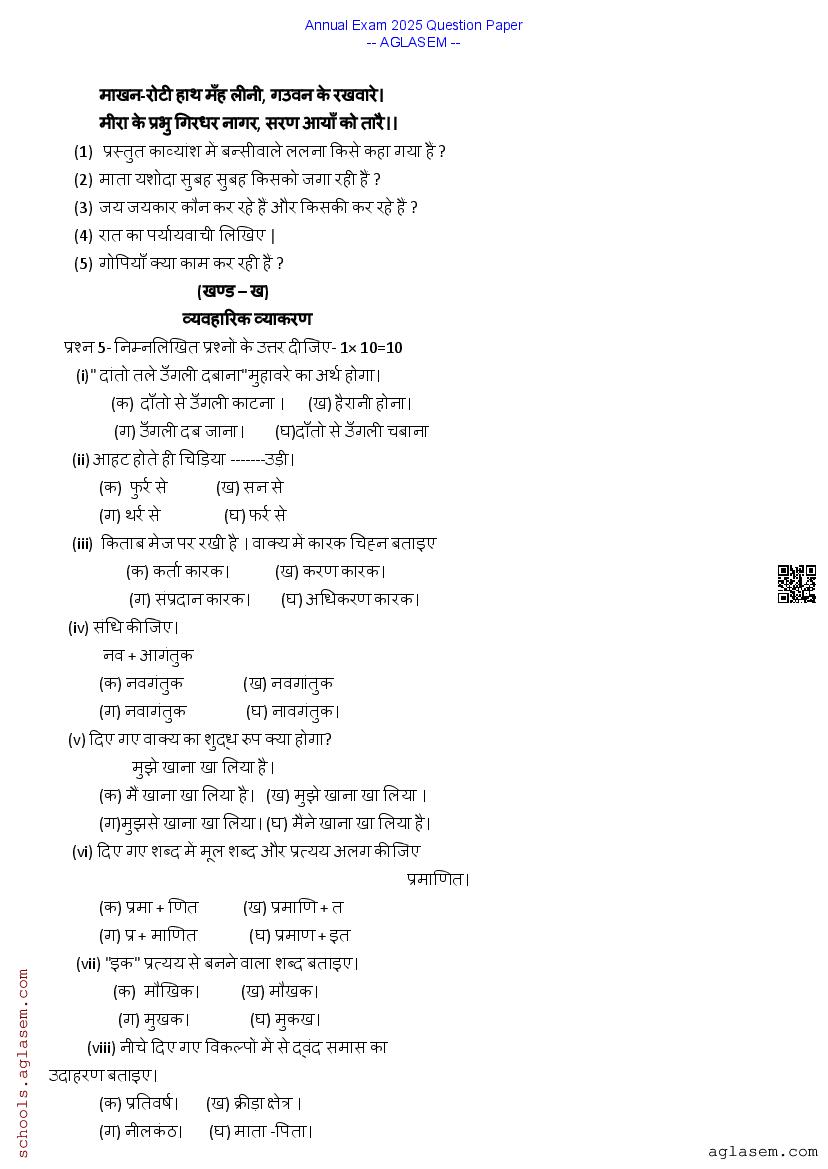 Class 7 Hindi Question Paper 2025 contains important practice questions and solutions based on the Hindi exam for 7th standard annual assessments. At aglasem.com, you can quickly download the 7th Annual Exam Hindi Question Paper PDF and previous year papers for free. The class 7 Hindi question paper is an essential study resource for exam preparation, helping you understand the exam pattern and frequently asked questions. If you are a 7th student, solving these Hindi previous year question papers will strengthen your preparation, improve time management, and boost confidence for the final exams.