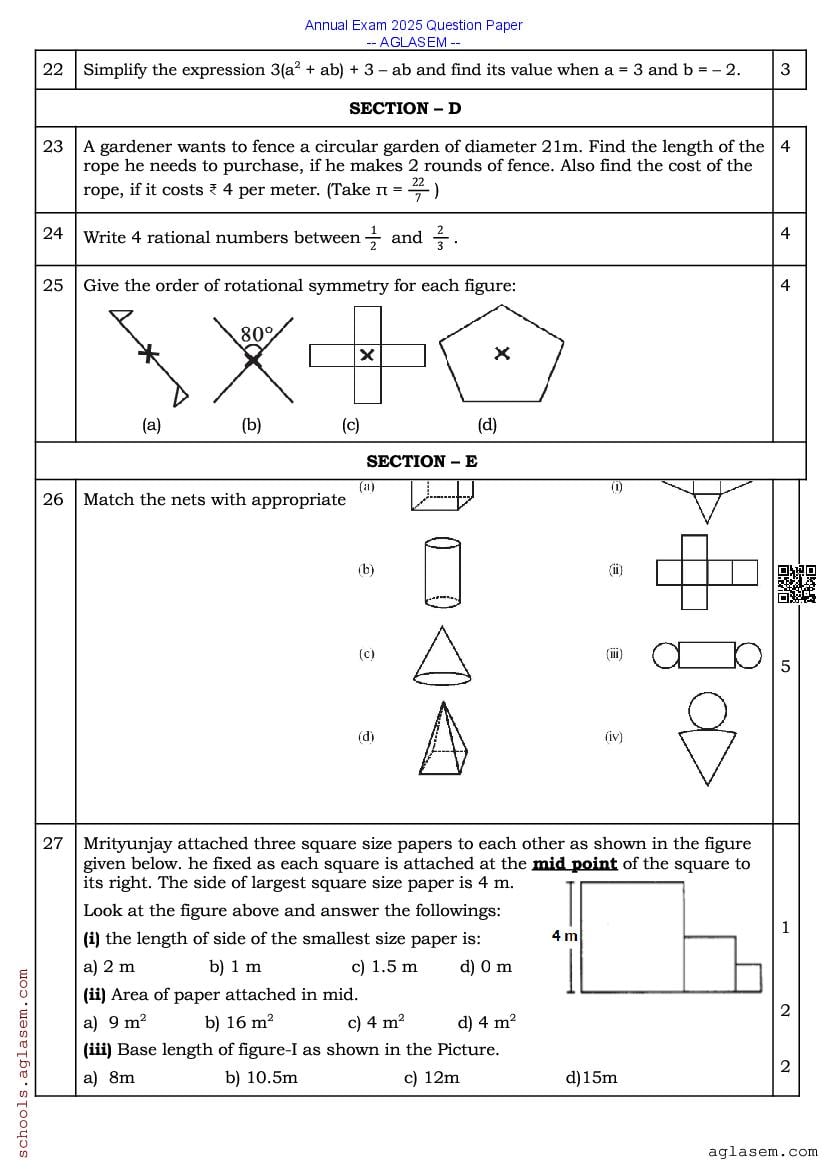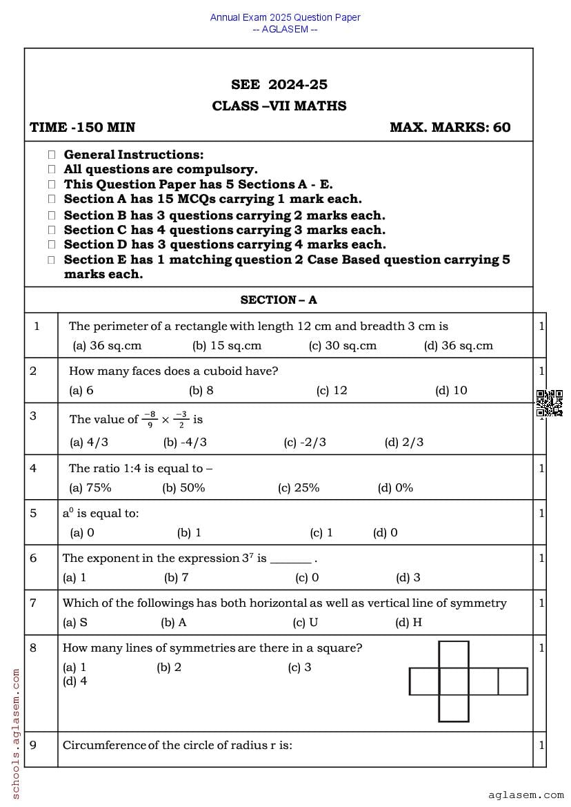Class 7 Maths Annual Exam Question Paper 2025 PDF
