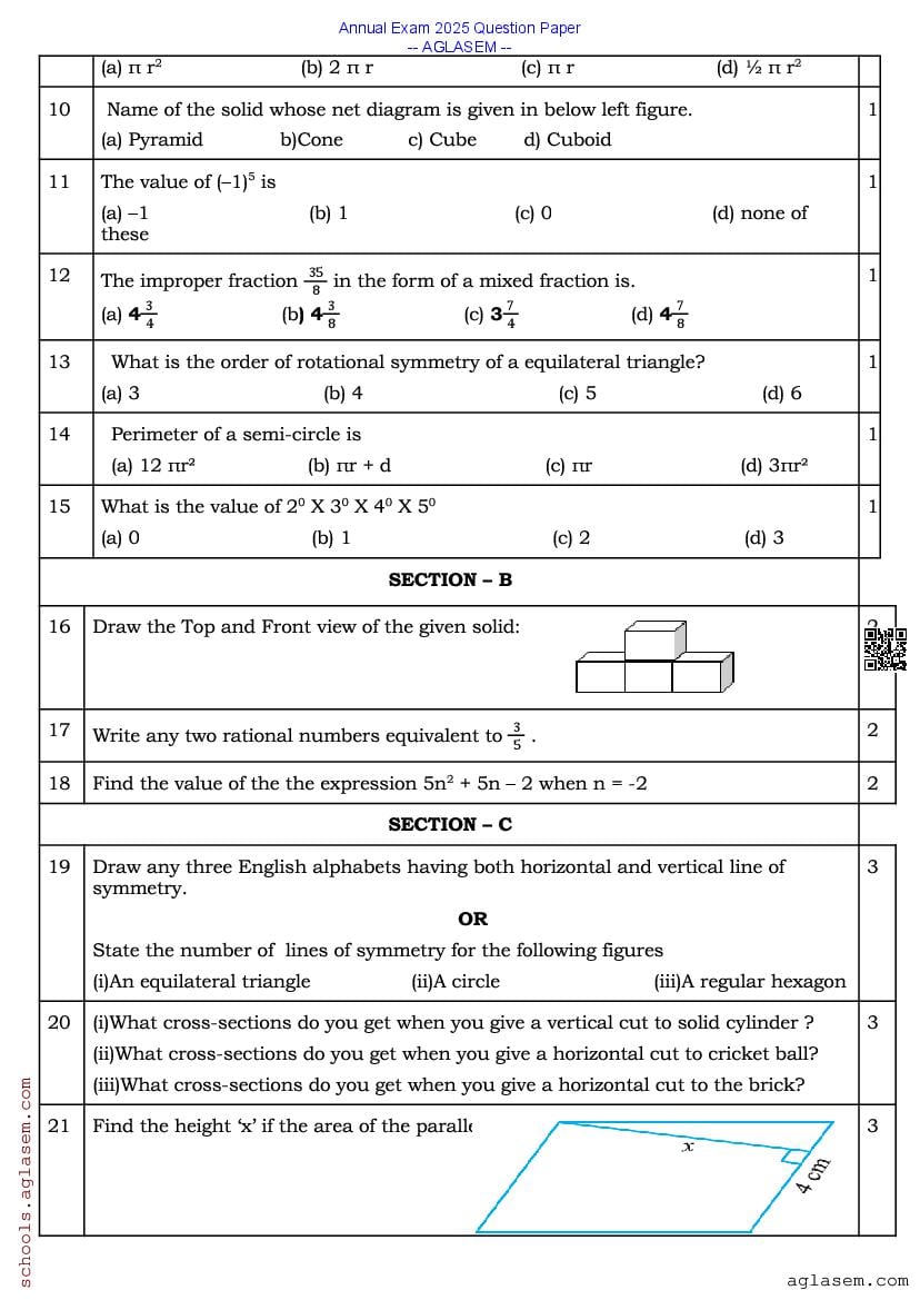 Class 7 Maths Question Paper 2025 contains important practice questions and solutions based on the Maths exam for 7th standard annual assessments. At aglasem.com, you can quickly download the 7th Annual Exam Maths Question Paper PDF and previous year papers for free. The class 7 Maths question paper is an essential study resource for exam preparation, helping you understand the exam pattern and frequently asked questions. If you are a 7th student, solving these Maths previous year question papers will strengthen your preparation, improve time management, and boost confidence for the final exams.
