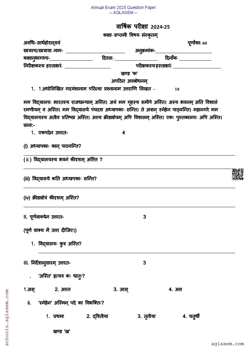 We have provided you the direct link to download Sanskrit question paper above. However if you want to read the 7th Sanskrit Annual Exam exam question paper here itself, that is also possible. The complete paper is as follows.