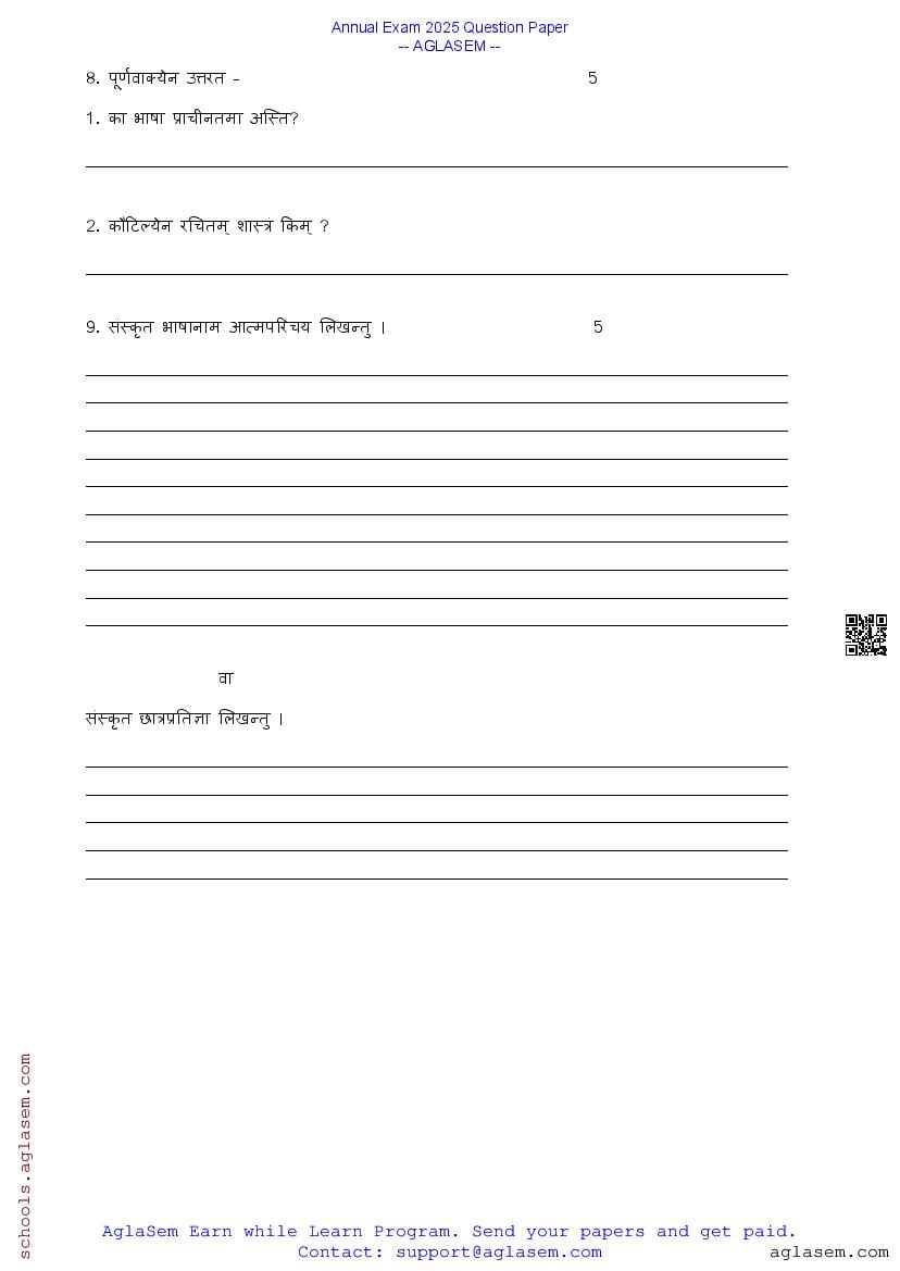 Class 7 Sanskrit Question Paper 2025 contains important practice questions and solutions based on the Sanskrit exam for 7th standard annual assessments. At aglasem.com, you can quickly download the 7th Annual Exam Sanskrit Question Paper PDF and previous year papers for free. The class 7 Sanskrit question paper is an essential study resource for exam preparation, helping you understand the exam pattern and frequently asked questions. If you are a 7th student, solving these Sanskrit previous year question papers will strengthen your preparation, improve time management, and boost confidence for the final exams.