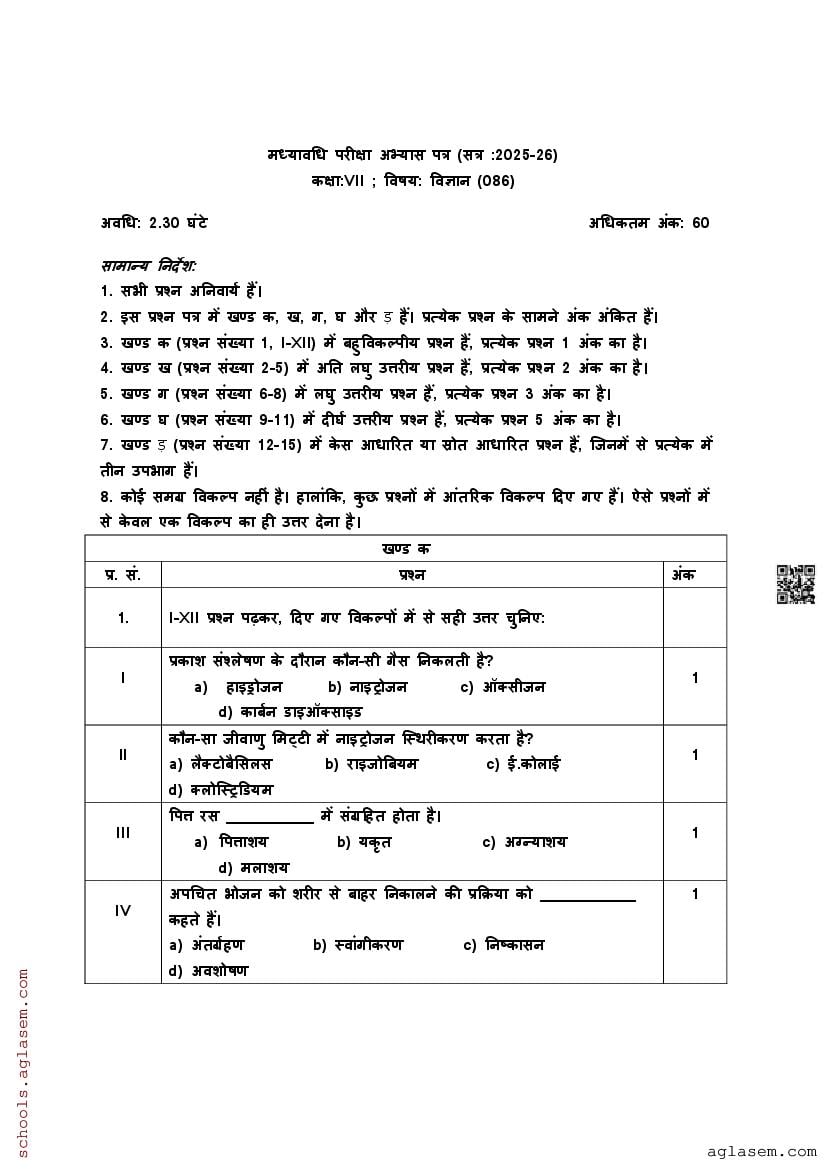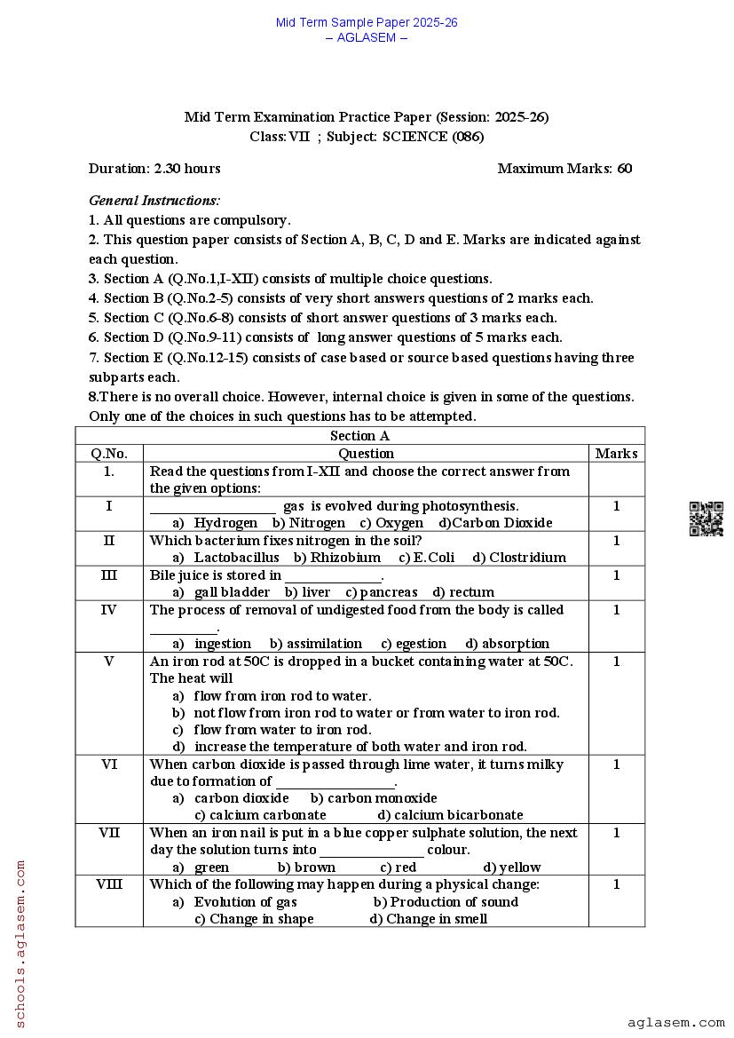 You can view and download Sample Paper for Standard 7 Mid-Term Exam 2025 for Science subject from aglasem.