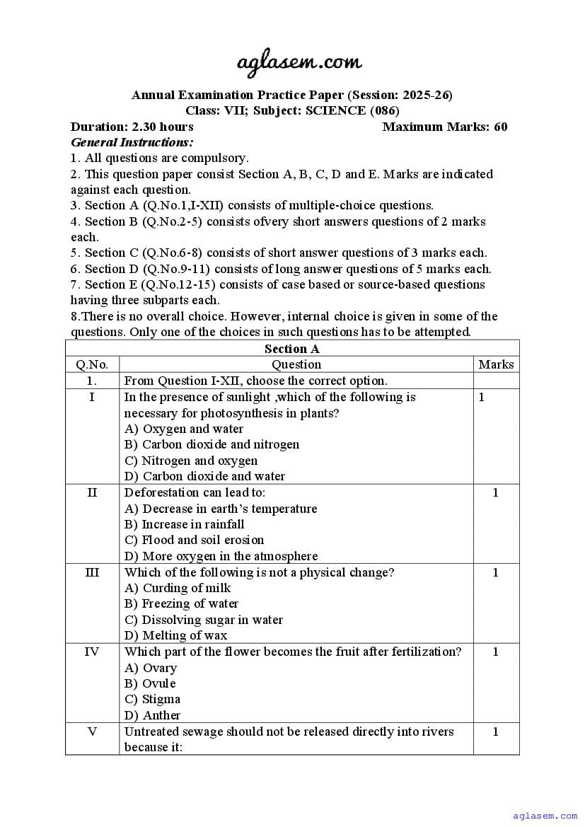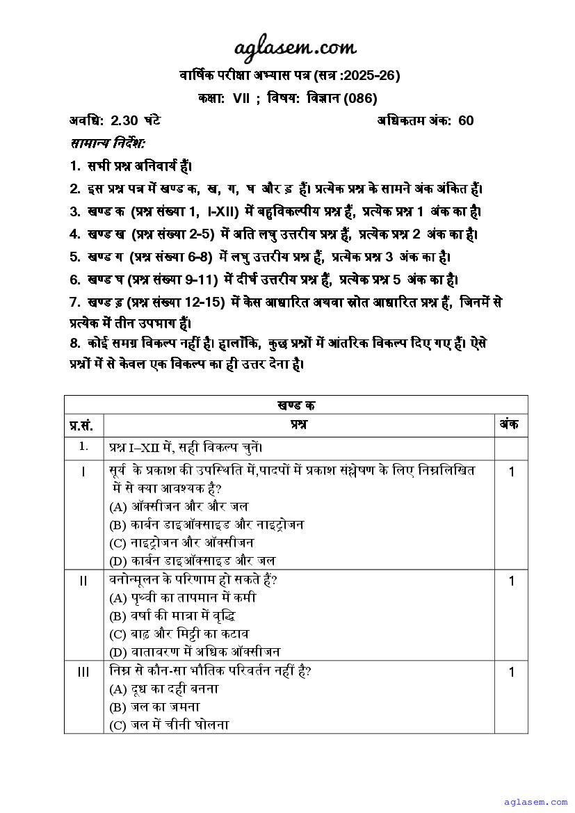 Class 7 Science Sample Paper 2026 is now available! If you are currently in class 7 and preparing for your annual or final exams, don’t miss the opportunity to download the Science sample paper PDF from aglasem.com. This comprehensive sample paper is designed specifically for class 7 and includes a variety of questions covering the entire Science syllabus for class 7th. By practicing these questions, you’ll be well-equipped to achieve excellent marks in your class 7 yearly exams!
