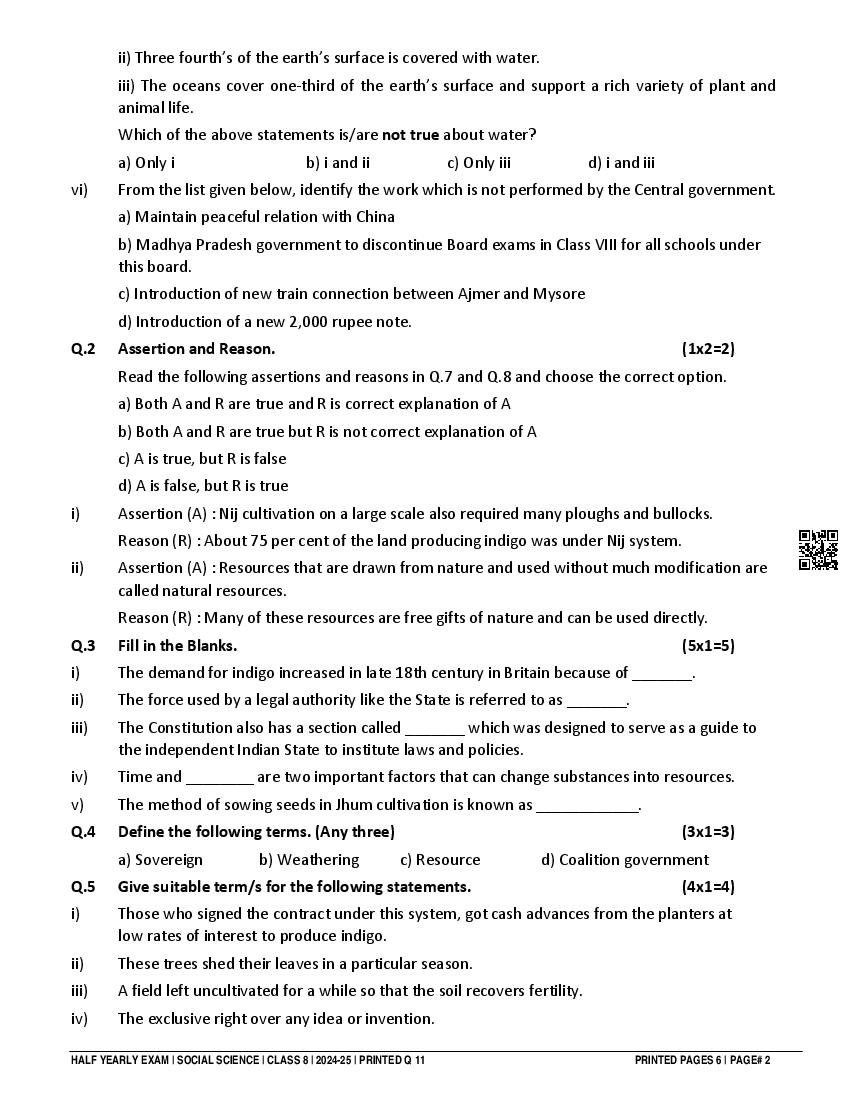 Class 8 Social Science Half Yearly Question Paper 2025 PDF