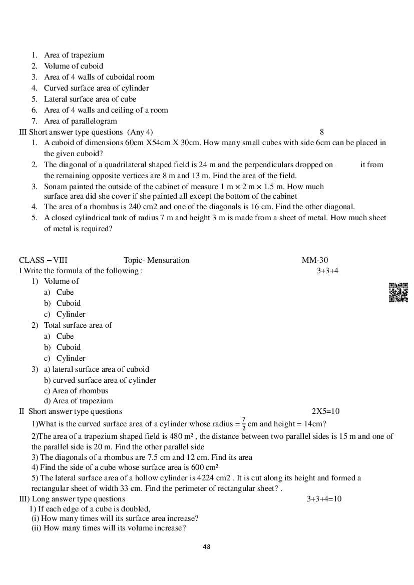 Candidates who are ambitious to qualify the Class 8 with good score can check this article for Notes, Study Material, Practice Paper. Above we provided the link to access the Notes, Important Question and Practice Paper of Class 8 Maths for topic Mensuration.