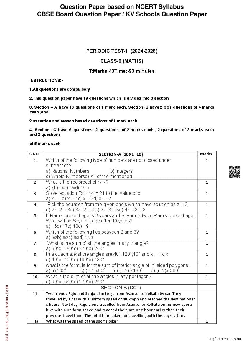 Class 8 PT 1 Question Paper 2024-25 Download Link – Click Here to Download 8th Periodic Test 1 Question Paper