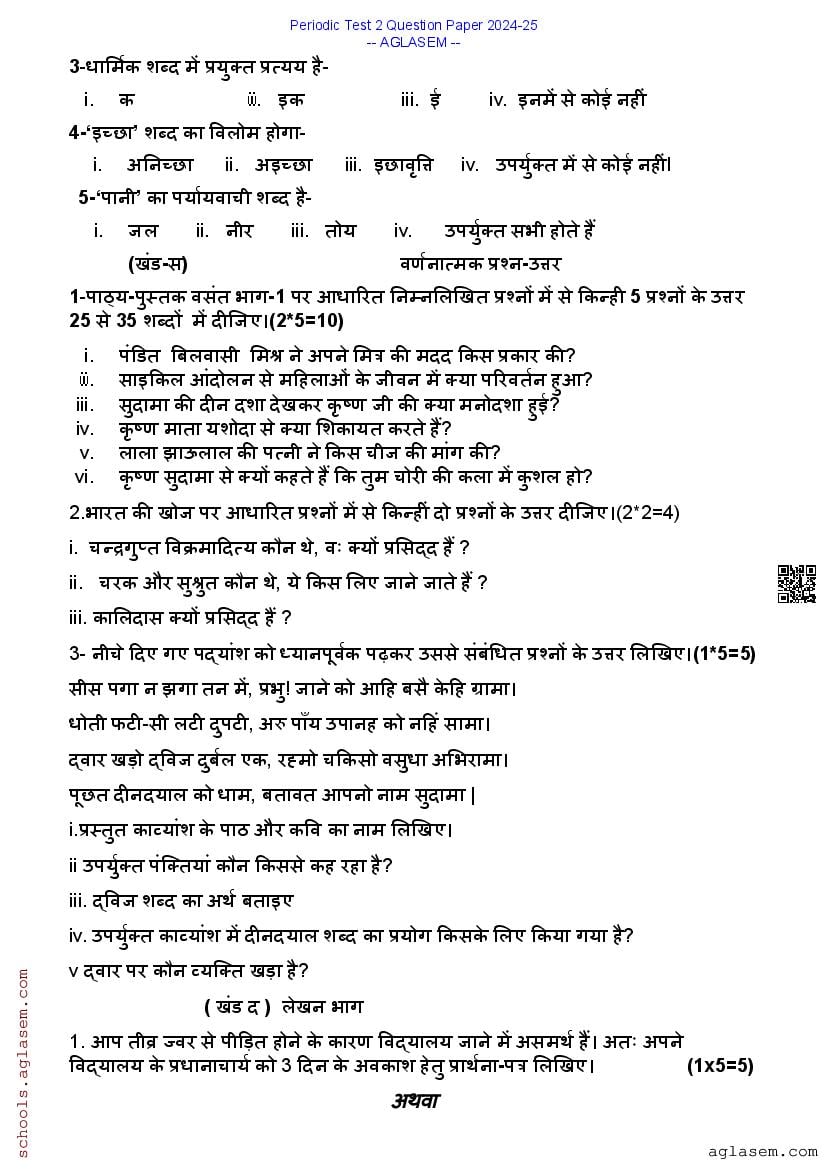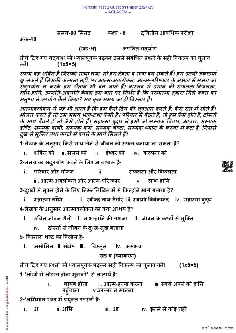 The Class 8 PT 2 Question Paper Hindi 2024-25 PDF is is made available here by aglasem for your exam preparation. You can download the Class 8 PT II Hindi Question Paper PDF from here on aglasem.com to prepare for this crucial exam. It is important to solve this Hindi question paper, along with other Class 8 PT Question Paper if you are a student in the 8th grade, as it helps you understand the pattern and type of questions you will face in your upcoming periodic test exams. The Hindi Periodic Test 2 Question Paper is designed to test the student’s understanding of various Hindi concepts taught in the first term. Here, you will know everything about the Class 8 PT 2 Hindi Question Paper, including tips, sample questions, and resources for effective preparation.
