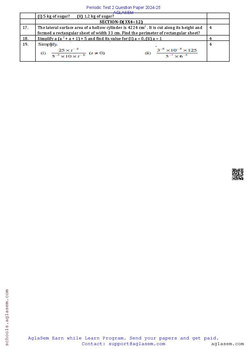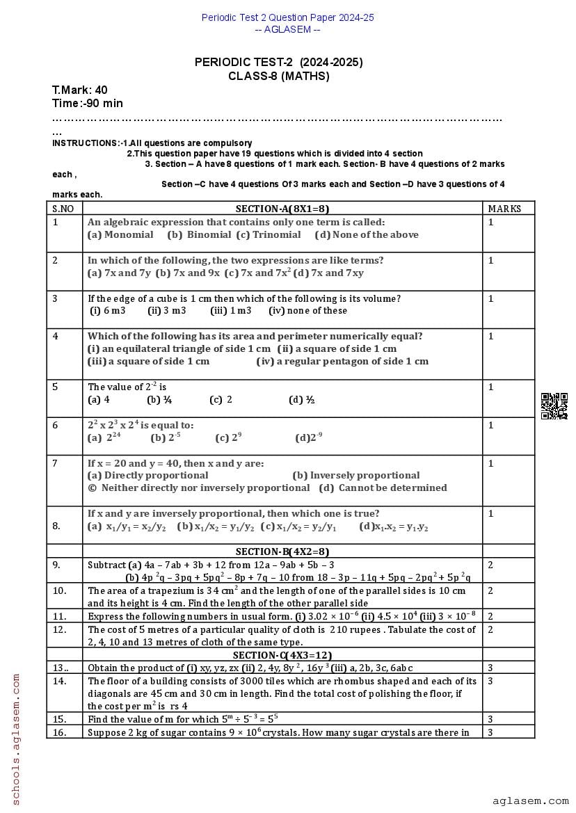 The Class 8 PT 2 Question Paper Maths 2024-25 PDF is is made available here by aglasem for your exam preparation. You can download the Class 8 PT II Maths Question Paper PDF from here on aglasem.com to prepare for this crucial exam. It is important to solve this Maths question paper, along with other Class 8 PT Question Paper if you are a student in the 8th grade, as it helps you understand the pattern and type of questions you will face in your upcoming periodic test exams. The Maths Periodic Test 2 Question Paper is designed to test the student’s understanding of various Maths concepts taught in the first term. Here, you will know everything about the Class 8 PT 2 Maths Question Paper, including tips, sample questions, and resources for effective preparation.