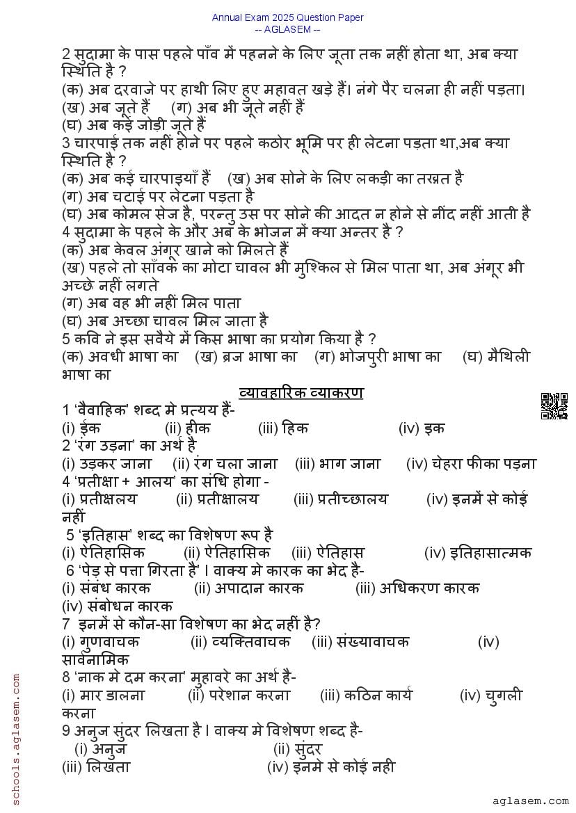 Class 8 Hindi Question Paper 2025 contains important practice questions and solutions based on the Hindi exam for 8th standard annual assessments. At aglasem.com, you can quickly download the 8th Annual Exam Hindi Question Paper PDF and previous year papers for free. The class 8 Hindi question paper is an essential study resource for exam preparation, helping you understand the exam pattern and frequently asked questions. If you are a 8th student, solving these Hindi previous year question papers will strengthen your preparation, improve time management, and boost confidence for the final exams.