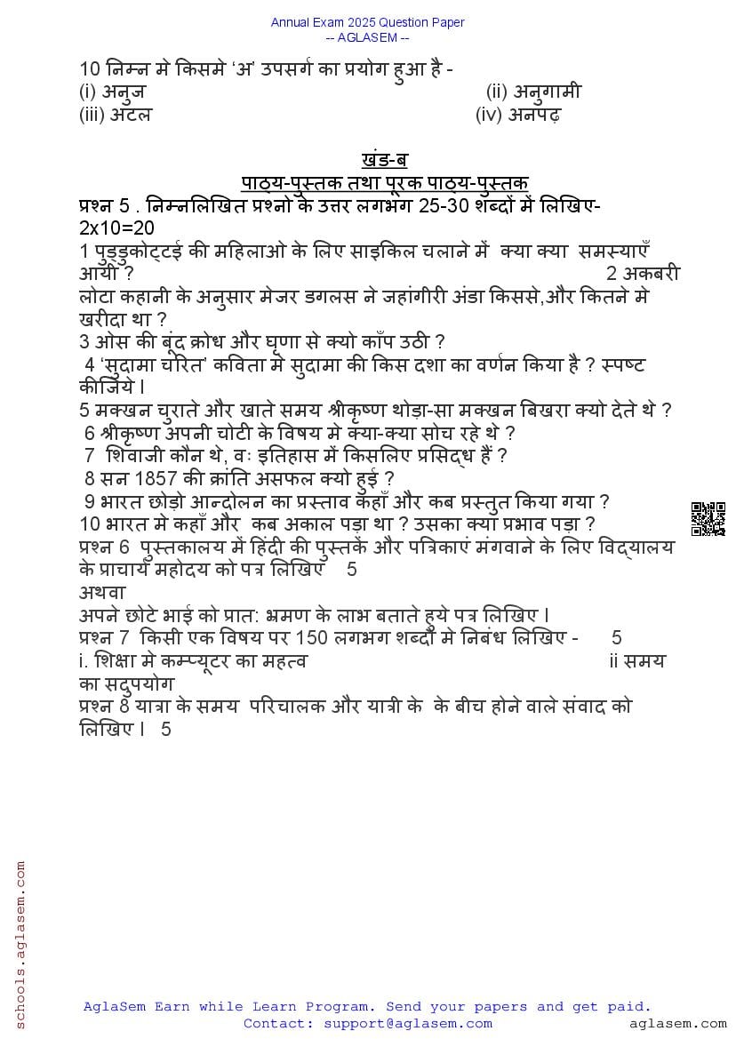 Class 8 Hindi Annual Exam Question Paper 2025 PDF