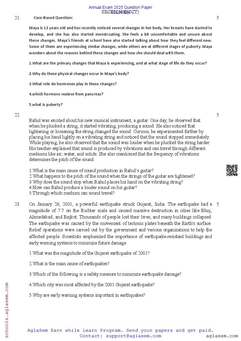 Class 8 Science Question Paper 2025 contains important practice questions and solutions based on the Science exam for 8th standard annual assessments. At aglasem.com, you can quickly download the 8th Annual Exam Science Question Paper PDF and previous year papers for free. The class 8 Science question paper is an essential study resource for exam preparation, helping you understand the exam pattern and frequently asked questions. If you are a 8th student, solving these Science previous year question papers will strengthen your preparation, improve time management, and boost confidence for the final exams.