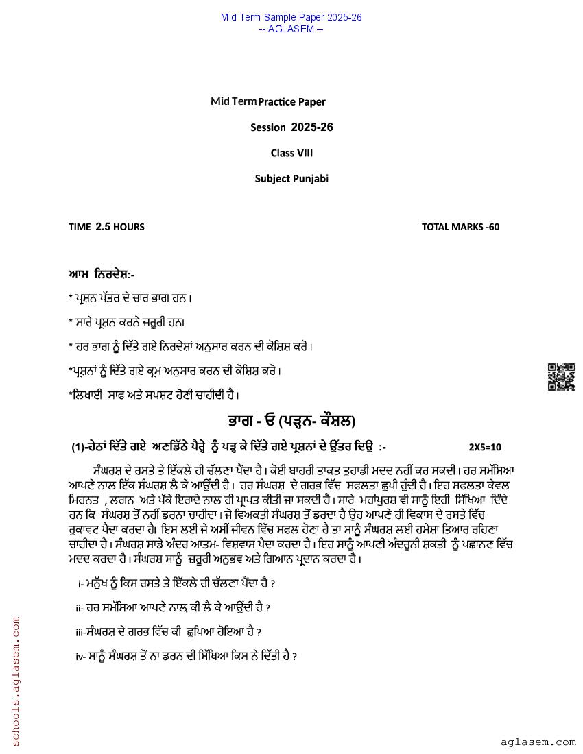 Get the Class 8 Punjabi Mid Term Sample Paper 2025 for your school mid term examination. These Class 8 Punjabi Mid Term Sample Paper 2025 for are developed by experts based on NCERT syllabus. You can now download the Class 8 Punjabi Mid Term Model Question Paper PDF here at aglasem. This class 8 mid term sample paper for Punjabi contains specimen questions from the latest class 8 Punjabi syllabus and gives you a good idea of what to expect in Punjabi paper in periodic tests, unit tests or term 1 examination. Therefore, by solving the Punjabi sample paper, you can aim for better marks in class 8 periodic test.