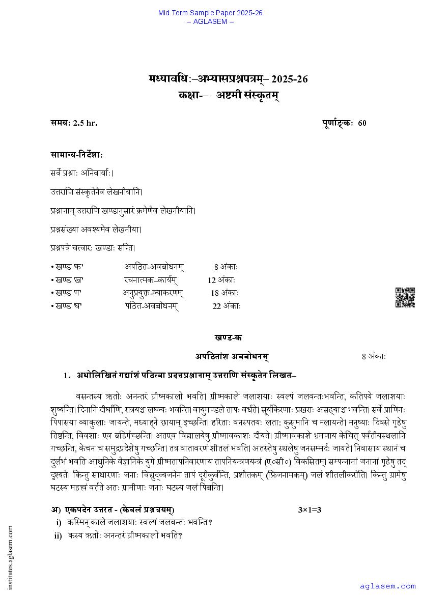 You can view and download Sample Paper for Standard 8 Mid-Term Exam 2025 for Sanskrit subject from aglasem.