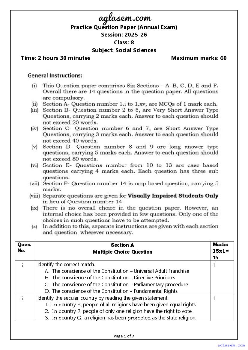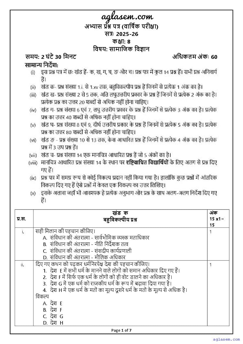 Class 8 Social Science Sample Paper 2026 is now available! If you are currently in class 8 and preparing for your annual or final exams, don’t miss the opportunity to download the Social Science sample paper PDF from aglasem.com. This comprehensive sample paper is designed specifically for class 8 and includes a variety of questions covering the entire Social Science syllabus for class 8th. By practicing these questions, you’ll be well-equipped to achieve excellent marks in your class 8 yearly exams!