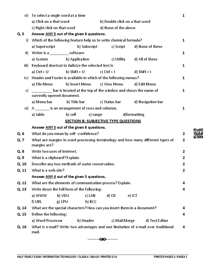 Class 9 Information Technology Half Yearly Question Paper 2025