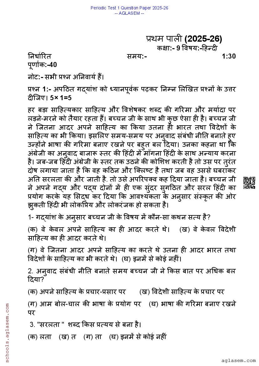The Class 9 PT 1 Question Paper Hindi 2025-26 PDF is is made available here by aglasem for your exam preparation. You can download the Class 9 PT I Hindi Question Paper PDF from here on aglasem.com to prepare for this crucial exam. It is important to solve this Hindi question paper, along with other Class 9 PT Question Paper if you are a student in the 9th grade, as it helps you understand the pattern and type of questions you will face in your upcoming periodic test exams. The Hindi Periodic Test 1 Question Paper is designed to test the student’s understanding of various Hindi concepts taught in the first term. Here, you will know everything about the Class 9 PT 1 Hindi Question Paper, including tips, sample questions, and resources for effective preparation.