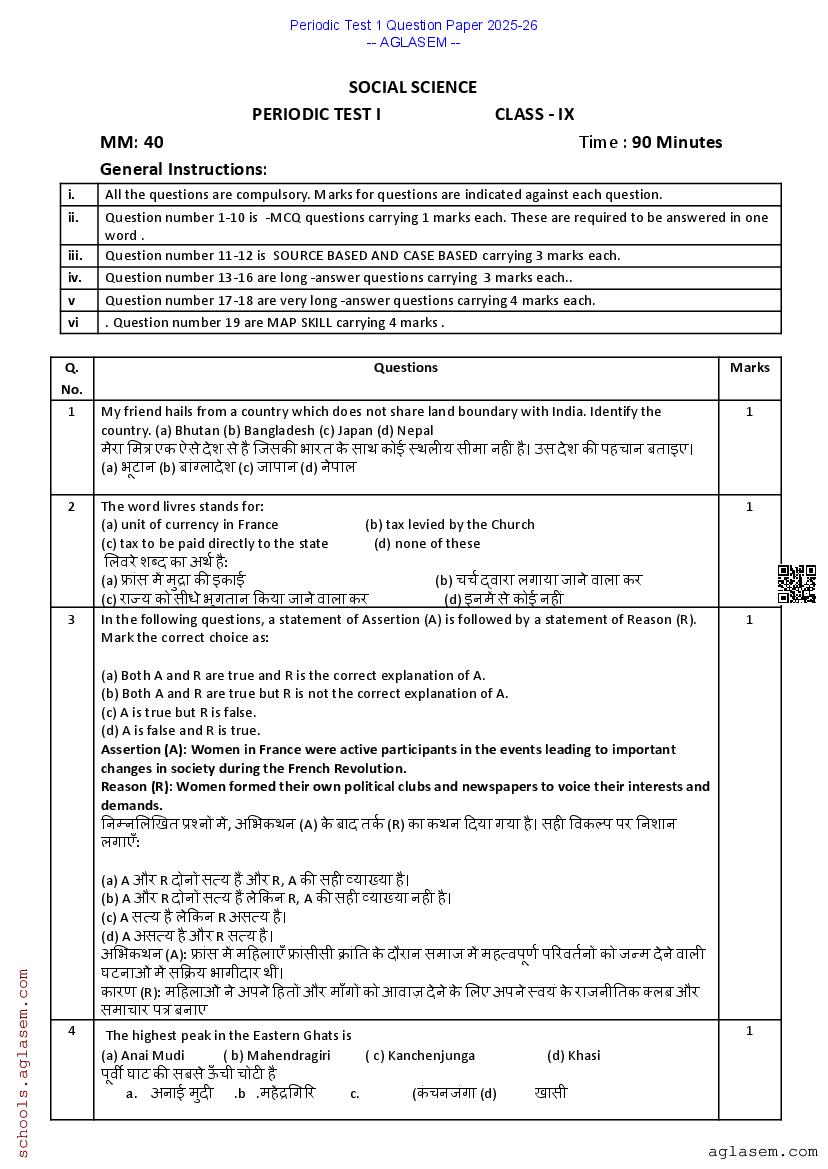 The Class 9 PT 1 Question Paper Social Science 2025-26 PDF is is made available here by aglasem for your exam preparation. You can download the Class 9 PT I Social Science Question Paper PDF from here on aglasem.com to prepare for this crucial exam. It is important to solve this Social Science question paper, along with other Class 9 PT Question Paper if you are a student in the 9th grade, as it helps you understand the pattern and type of questions you will face in your upcoming periodic test exams. The Social Science Periodic Test 1 Question Paper is designed to test the student’s understanding of various Social Science concepts taught in the first term. Here, you will know everything about the Class 9 PT 1 Social Science Question Paper, including tips, sample questions, and resources for effective preparation.