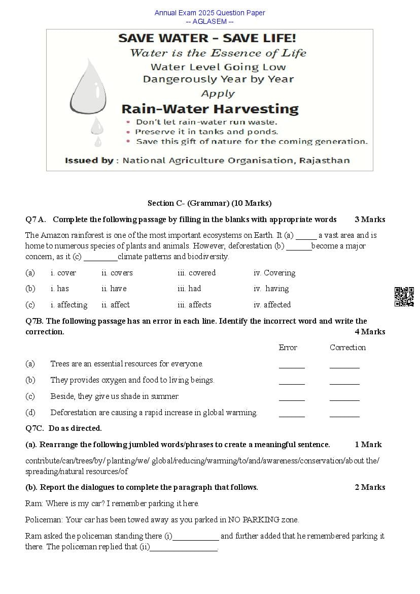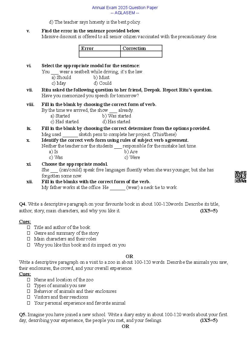 Class 9 English Question Paper 2025 contains important practice questions and solutions based on the English exam for 9th standard annual assessments. At aglasem.com, you can quickly download the 9th Annual Exam English Question Paper PDF and previous year papers for free. The class 9 English question paper is an essential study resource for exam preparation, helping you understand the exam pattern and frequently asked questions. If you are a 9th student, solving these English previous year question papers will strengthen your preparation, improve time management, and boost confidence for the final exams.