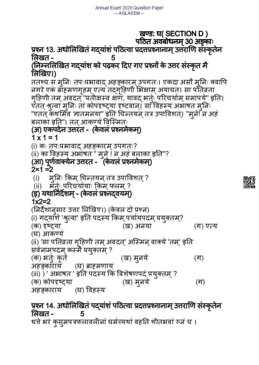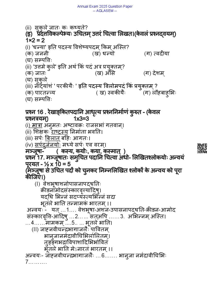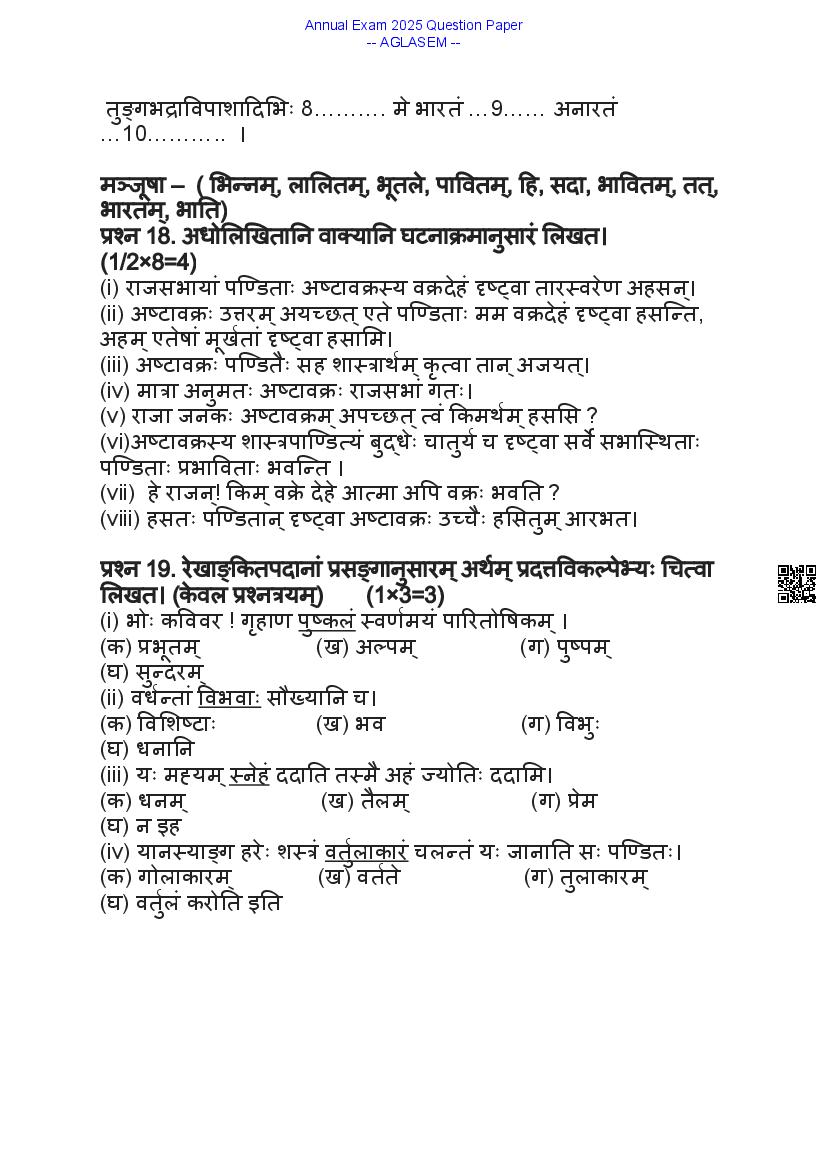 Class 9 Sanskrit Question Paper 2025 contains important practice questions and solutions based on the Sanskrit exam for 9th standard annual assessments. At aglasem.com, you can quickly download the 9th Annual Exam Sanskrit Question Paper PDF and previous year papers for free. The class 9 Sanskrit question paper is an essential study resource for exam preparation, helping you understand the exam pattern and frequently asked questions. If you are a 9th student, solving these Sanskrit previous year question papers will strengthen your preparation, improve time management, and boost confidence for the final exams.