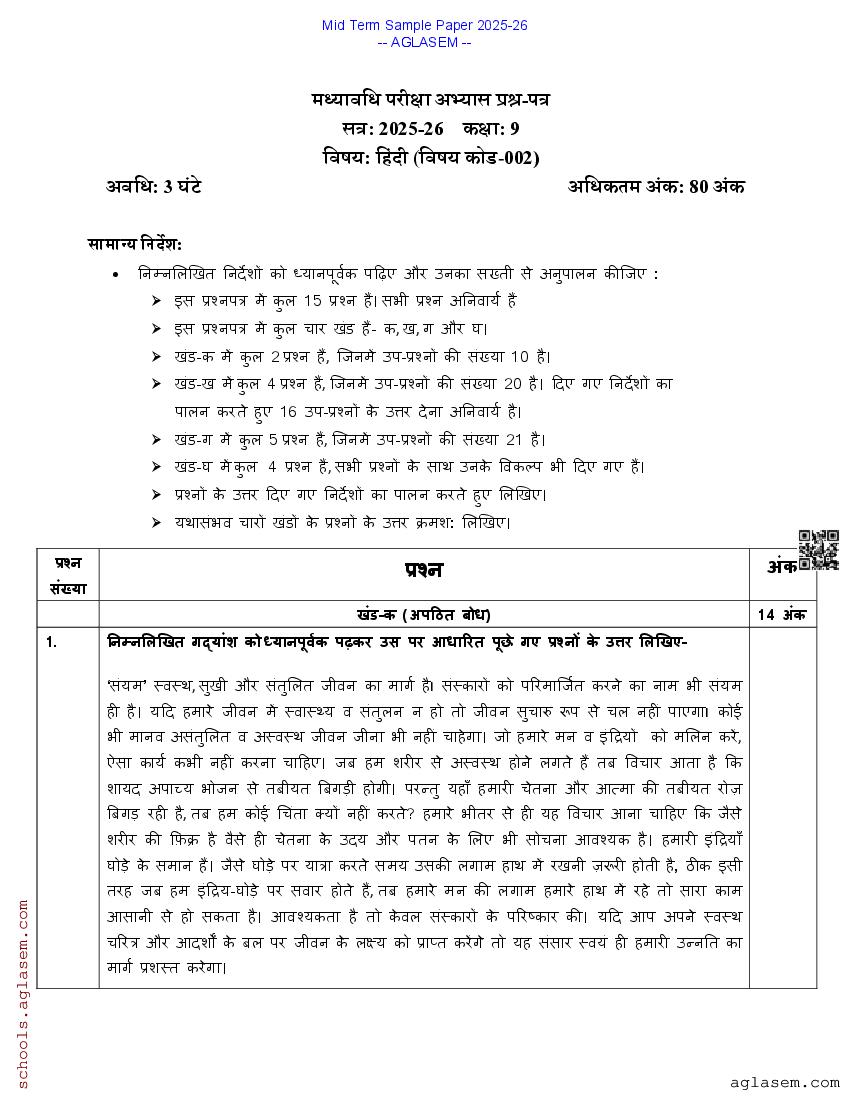 You can view and download Sample Paper for Standard 9 Mid-Term Exam 2025 for Hindi subject from aglasem.