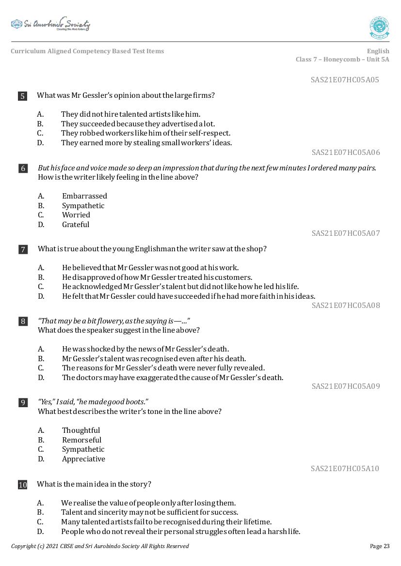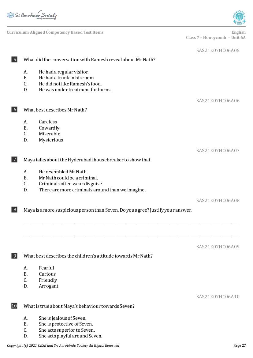 In addition to English, the Competency Focused Questions for all subjects for students in 7th standard are as follows.
