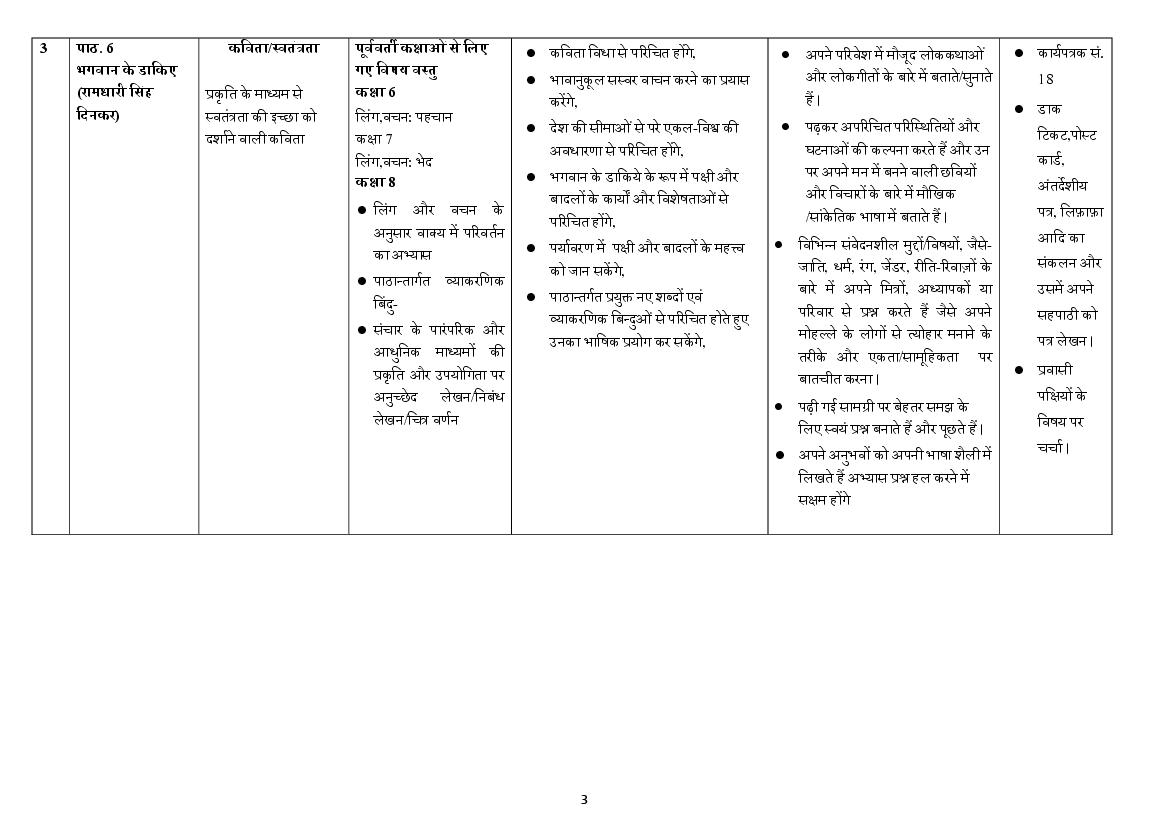 The Edudel syllabus for class 8 Hindi is as follows. It has the subject name (Hindi), code, contents with topic name, unit or chapter name, sub-topics, and date of completing the topic. Also whether the topic will come in Hindi mid-term, or annual examination.